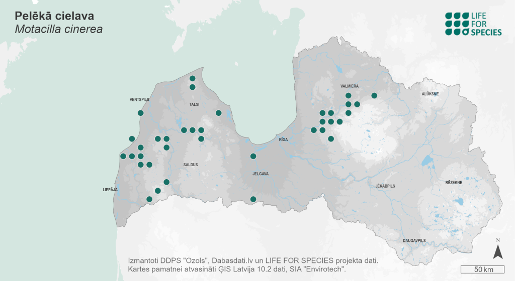 Summary. Grey Wagtail − Motacilla cinerea. In Latvia, no significant change in the distribution has occurred between 1980–1984 and 2000–2004, while growth was observed between 2000–2004 and 2013–2017. The AOO of the breeding population is 220 km2, the EOO – 26,647 km2. The breeding population had been previously estimated at 34–46 pairs (68–92 adult individuals), but it is likely that the population size is underestimated, as more recent data suggest that 25–30 pairs of the M. cinerea breed in Gauja National Park alone. The long-term as well as short-term population trend is positive. Mainly inhabits clean and swift rivers near sandstone cliffs and water mills. No threats to the species are known. The species needs to be included on the list of protected species of Latvia.