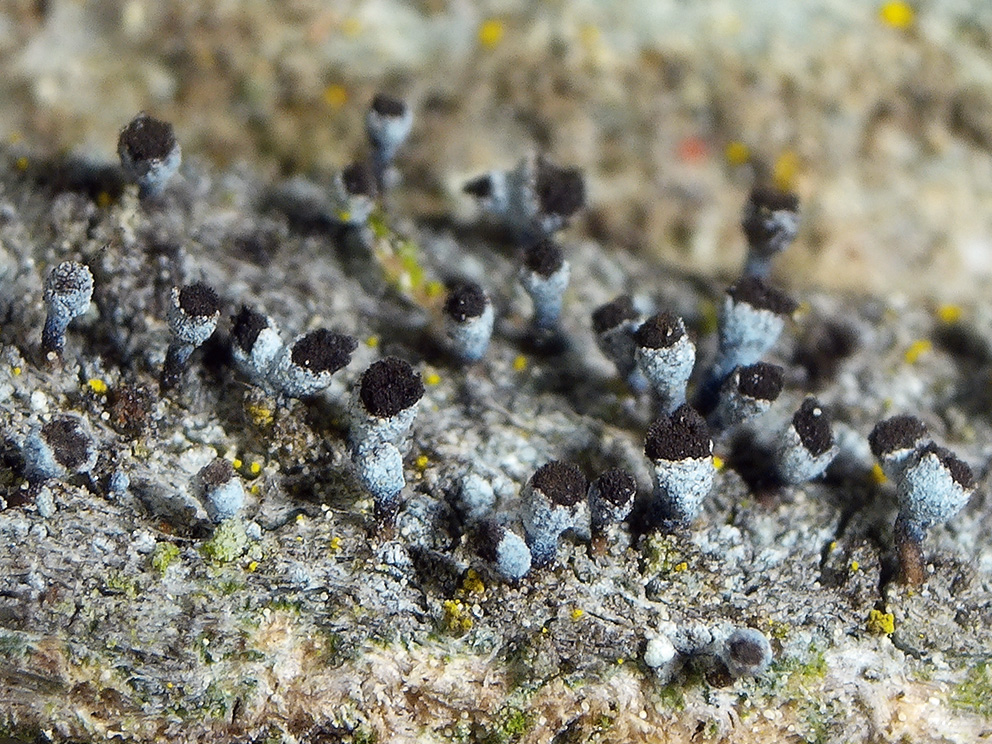 Summary. Chaenotheca cinerea occurs in North America and is widespread in Europe. It has been found in Western Asia. There are four localities in the eastern part of Latvia – in 2019, the species was found in three places in Pededze Valley and in 2022 – in the vicinity of Kārsava. The EOO is 183 km2, and the AOO is 16 km2. An epiphytic species, less commonly epixylic. The species is mostly found in old, relatively well-lit park-like habitats, and less commonly – in old broadleaf forests. Grows on the bark of old broad-leaved trees (mostly oak), and less commonly – on dead wood. It has also been found on an old wooden building in the vicinity of Kārsava. The species is threatened by logging activities – the removal of broad-leaved trees from forests. In park- like habitats, the species is sensitive to the overgrowth of old broad-leaved trees with shrubs. The destruction or conversion of old wooden buildings is also a threat. Assessed as a Critically Endangered (CR) species because the number of mature individuals does not exceed 50. The species must be included on the list of protected species. Two known localities are situated in protected areas – “Lubāna mitrājs” and “Mugurves pļavas” Nature Reserves. Old broad-leaved trees in open habitats and forests must be preserved. Overgrowth with shrubs must be cleared around the trees inhabited by the species. The conservation of old wooden buildings or parts of buildings where the species has been found on must be encouraged.