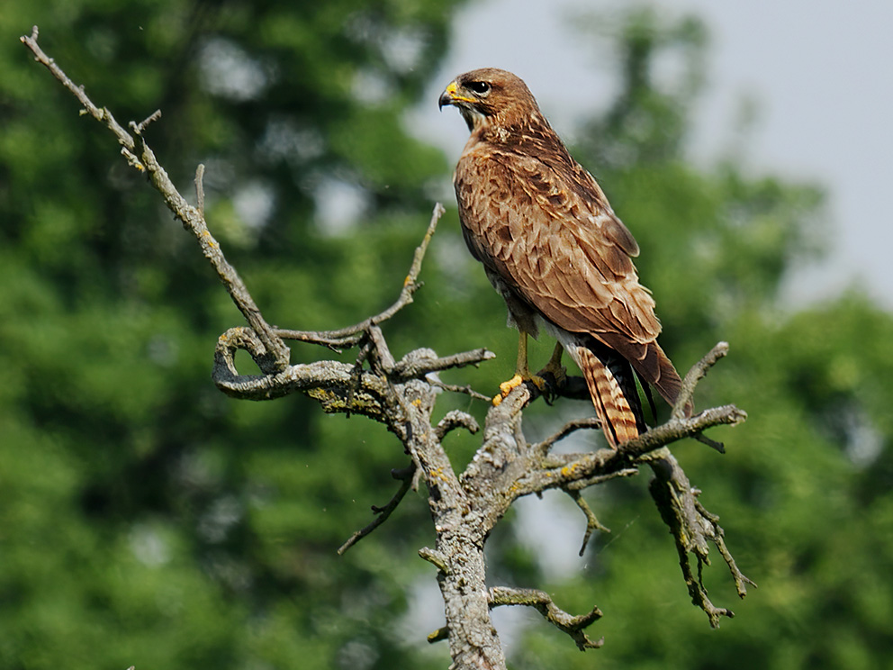 Summary. Eurasian Buzzard − Buteo buteo. In Latvia, the distribution did not change considerably between 1980–1984 and 2000–2004 and declined between 2000–2004 and 2013–2017. The AOO of breeding population is 5,988 km2, the EOO – 79,912 km2. The breeding population is estimated at 17,304–29,720 pairs (34,608–59,440 adult individuals). The population is declining in the long term, as well as in the short term. Over three generations, the population has declined by 61%. The breeding habitat of the species includes forests interspersed with open landscapes – fields, grasslands, wetlands, etc., where it forages. They also breed in small forest clumps. In larger aggregates of forests, they usually breed at the forest edges. The threats have not been studied in Latvia, but it is likely that the increase in logging intensity has played a significant role in the decline of the population. The species can also be affected by pesticide pollution. Historically, the most significant threat has been persecution of the species, which may still be taking place in some places. Wind farm development could be a potential threat. Monitoring of the breeding population of the species is ongoing. The species needs to be included on the list of protected species of Latvia. The preservation of nests, suspension of logging during the breeding season and reducing the use of pesticides on farmland are required for the preservation of the species.