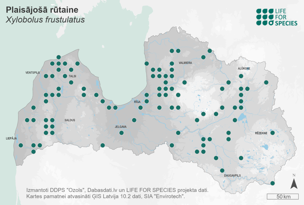 Summary. Ceramic fungus – Xylobolus frustulatus. Distributed across North America, Northern Europe, and Asia. In Europe, it is found in the nemoral and hemiboreal zones. It is relatively rare in Latvia, with about 90 known localities. The EOO is 65,411 km2, and the AOO – 712 km2. There is a lack of data on the regional population size and changes. The number of mature individuals is about 950. It is a wood saprotroph, causing slow brown rot and cavities in the trunk. It grows on dead wood of old oak – trunks, large branches, rarely on other deciduous trees. The species is found in forests, river valleys, parks, alleys, and wooded meadows. In Latvia, the species is threatened by forestry activities, resulting in a reduction of the area of broadleaved forests with old oak, as well as a decrease in the amount of dead oak wood in such forests. It is assessed as Vulnerable (VU) due to its small regional population and expected further decline. It is a protected species in Latvia for the conservation of which micro-reserves can be established. Its legal conservation statuss must be maintained. Almost 80% of the regional population is found in protected nature areas – in all national parks and several Nature Reserves, e.g. “Lubāna mitrājs” and “Sitas un Pededzes paliene”. The conservation measures are mainly related to ensuring the availability of suitable habitats and substrate – large old oaks with dead branches or logs. The conservation of the species is promoted by the protection of noble trees. However, medium-sized oaks with the potential to become host trees should also be protected. Research is needed on the distribution, ecology and threats to the species.