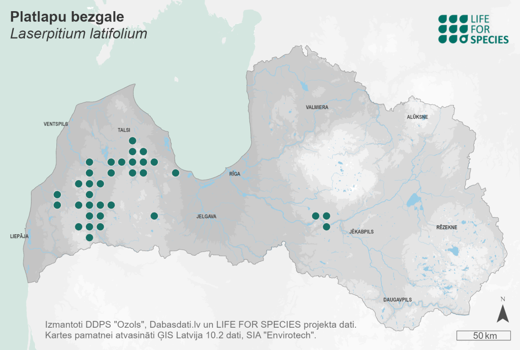 Summary. Broad-leaved laserwort – Laserpitium latifolium. It is rather rare in Latvia, found almost exclusively in the western part, mainly in the River Abava and the River Venta Valleys, and isolated localities in the River Daugava Valley. The EOO is 13,332 km2, and the AOO – 384 km2. Since the species is not on the list of protected species, insufficient attention has been paid to recording its localities. However, since the species does not occur in the entire country, it is assumed that the AOO does not exceed the threshold of the EN category. Studies on the distribution, population size and its changes have not been conducted. The species grows as single plants, in small groups, or forms large stands. L. latifolium is found mainly in river valleys and on the slopes of lake depressions, mixed forests, floodplain and forest edge scrub, and dry and mesic meadows. The main threats to the species are intensive forestry, changes in land use and cessation of grassland management. A large percentage of localities occur in protected areas: the “Abavas senleja”, “Riežupe”, “Talsu pauguraine” Nature Parks, the “Ventas ieleja”, and “Ventas un Šķerveļa ieleja” Nature Reserves. It is necessary to ensure the protection and appropriate management of habitats suitable for the species. The distribution and population size must be estimated. It is recommended to include the species on the list of protected species in Latvia.