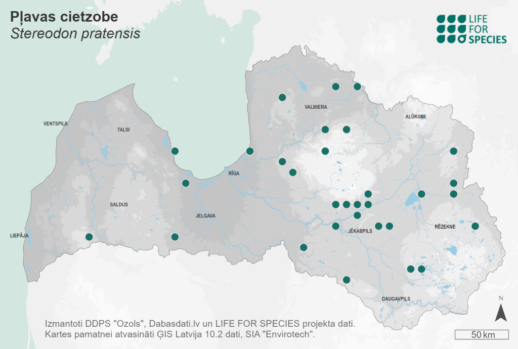Summary. Meadow plait-moss – Stereodon pratensis. The moss species is found throughout the Baltic countries and Scandinavia, and is widespread in Central Europe, northern Asia and North America. It was first found in Latvia by A. Āboliņa in 1958. Currently, 37 localities are known for the species, most of them in Vidzeme and Latgale, with only two localities in Kurzeme. EOO is 40,341 km2, and AOO is 116 km2. In Latvia, no quantitative studies on the regional population size and changes of the species have been carried out. The subpopulations of the species are to be assessed as stable. In Latvia, the species most commonly grows in transition mires, swamps and spring-rich forests, primarily in wet forest types where birch and spruce dominate. The species is threatened by a decline in groundwater levels and eutrophication. Transition mires are threatened by overgrowth and afforestation. In Latvia, similar to Central Europe, the species is negatively impacted by the cessation of traditional grazing and mowing in fens and calcareous mires, which are beginning to overgrow with Sphagnum species and grasses. The subpopulations of the species are stable, however, due to the unfavourable status of the bog habitats in Latvia, it is assessed as Near Threatened (NT). The species should be included on the list of protected species of Latvia. It is found in protected nature territories – the Krustkalni and Teiči Strict Nature Reserves, the “Vesetas palienes purvs” and “Lubāna mitrājs” Nature Reserves and the Ķemeri National Park. Protection of the species’ territory should be ensured and restoration of habitats and natural processes, public education and research on population size, distribution, trends and threatening factors should be carried out.
