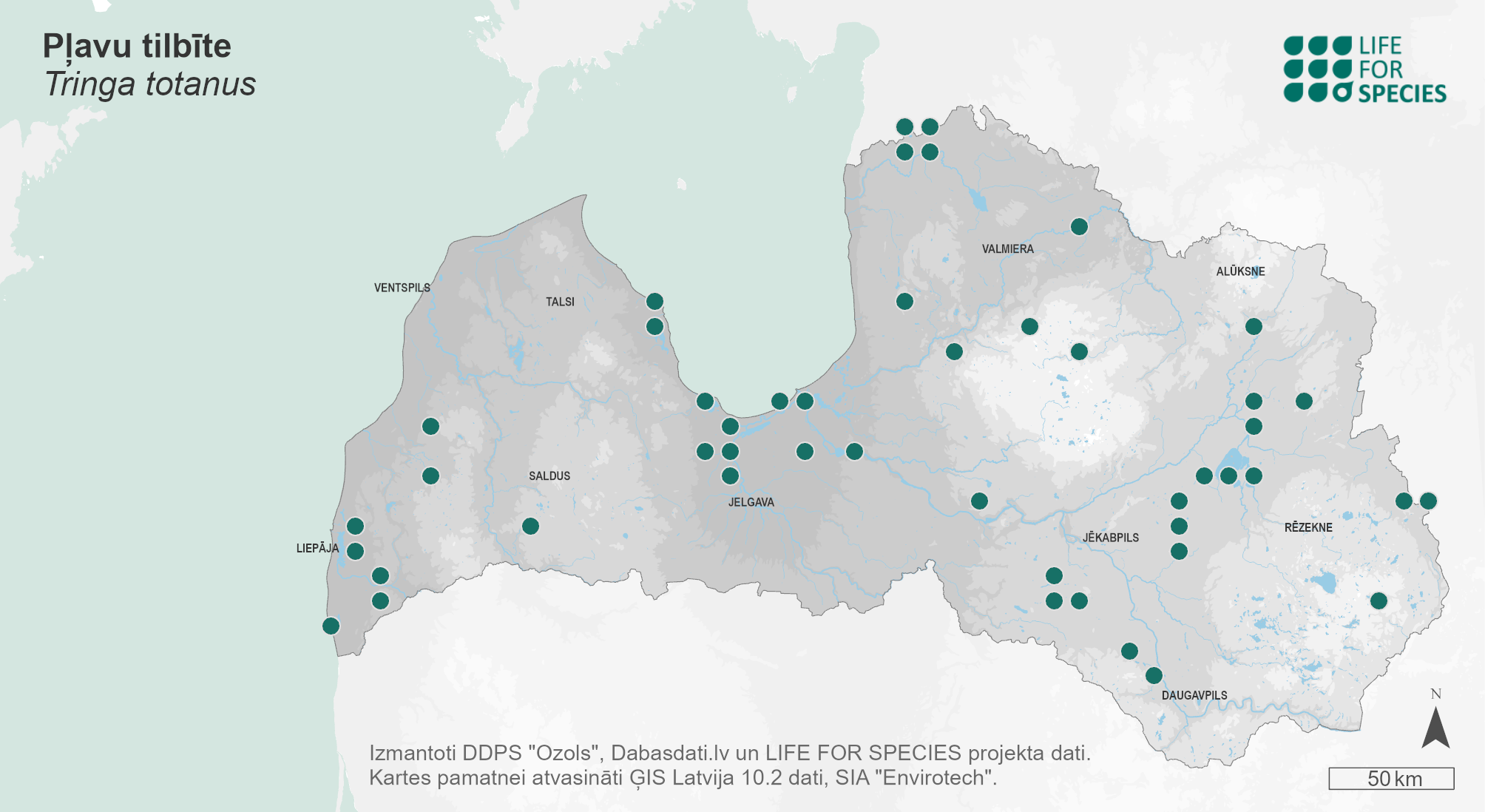 Summary. Common Redshank − Tringa totanus. In Latvia, the distribution declined between 1980–1984 and 2000–2004, and it continued to decline between 2000–2004 and 2013–2017. The AOO of the breeding population is 268 km2, the EOO – 59,945 km2. The breeding population is estimated at 140–300 pairs (280–600 adult individuals). The long-term, as well as short-term population trend, is negative. Over three generations, the population has declined by 46%. Inhabits grasslands of varying moisture, including raised bogs. The species is threatened by loss of breeding and wintering habitat due to increasing agricultural intensity, wetland drainage, flood control measures, afforestation, land development, industrial development, grassland improvement and overgrazing. The species is susceptible to avian influenza and, therefore, may suffer from future outbreaks of the disease. The legal status of protected species needs to be maintained in Latvia. Conservation of wet grasslands, including the organisation of mowing in a manner that minimises the destruction of nests and brood mortality, is required for the conservation of the species.