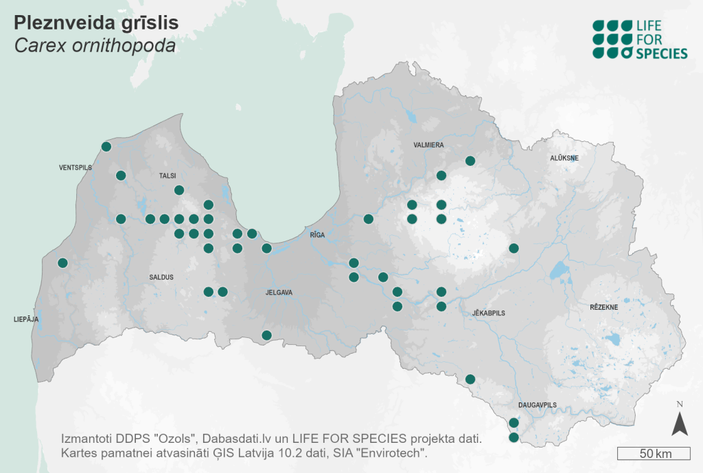 Summary. Bird’s-foot sedge – Carex ornithopoda. It is fairly rare in Latvia, with the largest number of localities present in the western part of the country. The distribution of the species is mainly associated with river valleys – Daugava, Abava, Gauja, Imula, Amula and Amata. The EOO is 39,889 km2, and the AOO – 276 km2. The EOO has not changed significantly compared to what was previously known. However, there are no recent data from many sites in the River Daugava Valley. There is no data on the size of subpopulations in each locality and population dynamics in Latvia. In Latvia, it is found mainly in dry calcareous grasslands, in drier parts of Molinion grasslands, in tufa-forming springs, rarely in forests on calcareous soils, abandoned gravel and dolomite quarries, harvested peatlands, places with calcium-rich spring discharges, places where calcareous soil is exposed and on dolomite outcrops. The main threats are the cessation of grassland management, afforestation and ploughing up of semi-natural grasslands, and forest drainage near springs and modification of springs. It is unknown what percentage of the population occurs in protected areas. It is necessary to clarify the distribution and determine the population size, identify places with the largest number of individuals and ensure their conservation, i.e., by establishing an appropriate protection regime (microreserves, protected areas or relevant zonation), restoring overgrown grasslands and re-establishing regular management, preserving natural and slightly modified spring habitats.