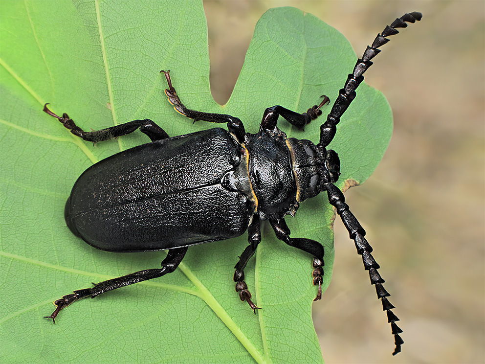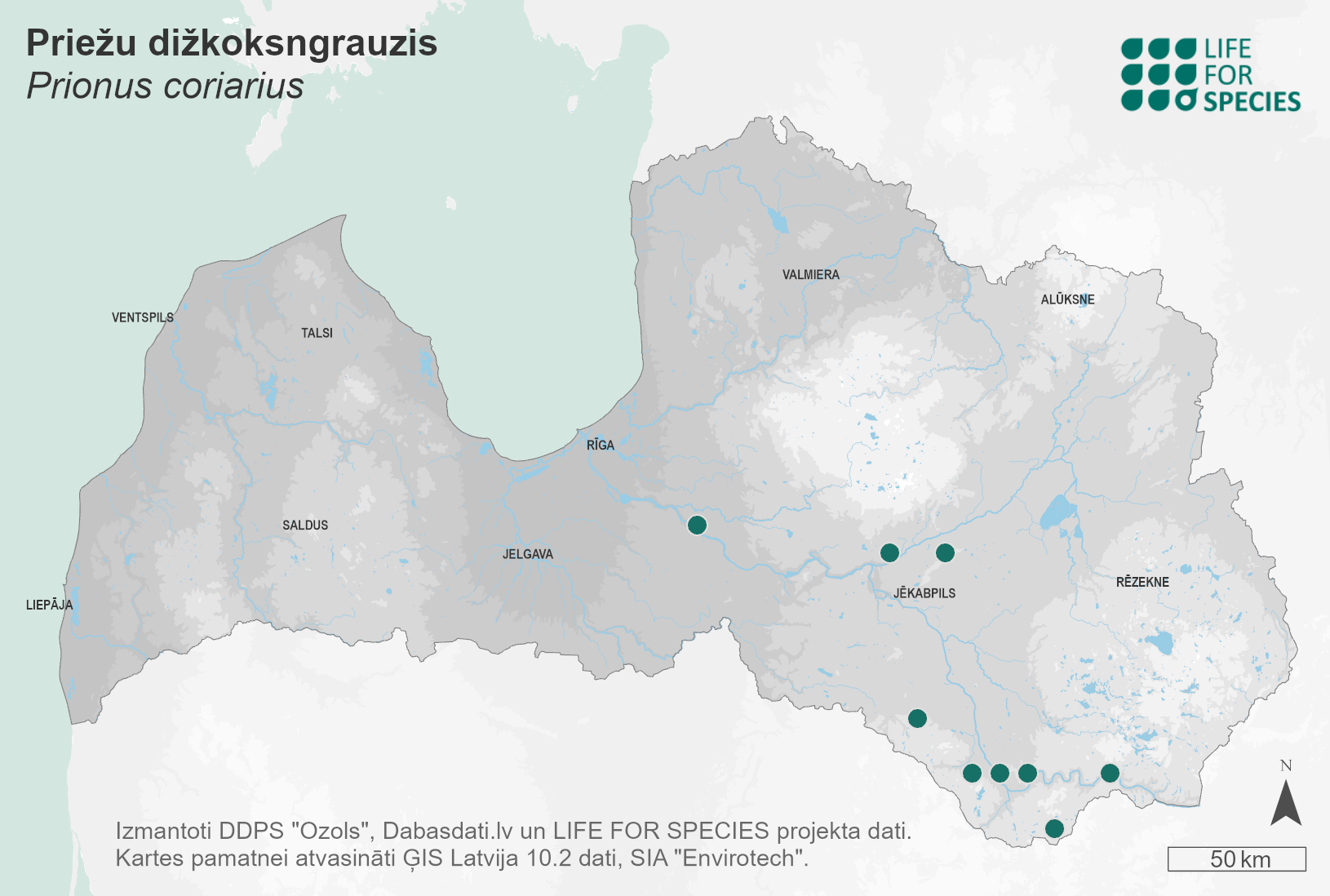 Summary. Tanner beetle – Prionus coriarius. A Palaearctic species, rare throughout its range. It occurs from the Iberian Peninsula and the British Isles to western Siberia. Latvia is situated in the northern part of the distribution range, where the regional population is severely fragmented. In Latvia, the species is found only in the eastern and south-eastern parts of the country, with 11 known localities. The EOO is 6,000 km2, and the AOO – 40 km2. In Europe, the regional population is declining. The state and trends of the Latvian regional population are unknown, however, considering the species’ connection with natural forest habitats and large trees, it is concluded that the AOO and the population are declining. The species is mainly found in old coniferous (boreal) or mixed forests. In Latvia, it is most often observed in old Scots pine and pine mixed forests, as well as in parks with conifers and various broadleaved trees (for example, Ilgas manor park and Medumi park). Larvae develop in large roots and stumps of conifers and broadleaved trees. The main threat is the decline of old-growth forests and the general decline of the amount of decaying wood in forests and urban areas. Therefore, it is necessary to preserve old forests and decaying wood in forests and parks. The species has been assessed as Vulnerable (VU) since the AOO is small, the EOO is 6,000 km2 and it is predicted that the regional population and the AOO will continue to decline. The species is included in the 2nd edition of the Red Data Book of Latvia (Barševskis 1998). A protected species in Latvia and its legal protection status needs to be maintained.