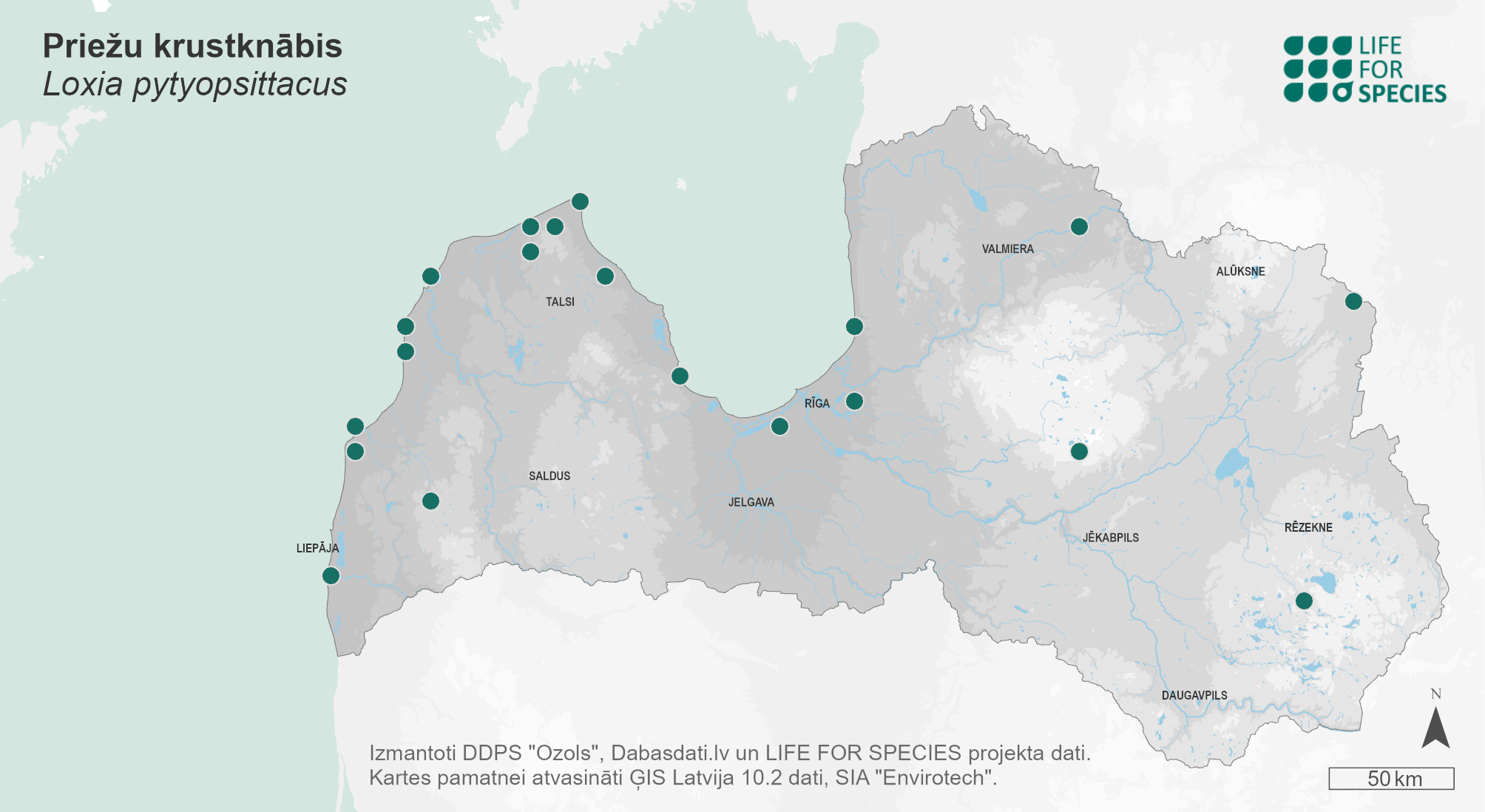 Summary. Parrot Crossbill − Loxia pytyopsittacus. Due to the rare occurrence of the species, an objective assessment of distribution changes in Latvia is impossible. The AOO of the breeding population is 104 km2, the EOO – 54,690 km2. The breeding population is estimated at 5–20 pairs (10–40 adult individuals). The long-term as well as short-term population trend is unknown. The species inhabits pine and mixed coniferous forests. The species is threatened by the felling of mature pines, which affects seed availability. The species needs to be included on the list of protected species of Latvia. Conservation of old pine forests is essential for the protection of the species.