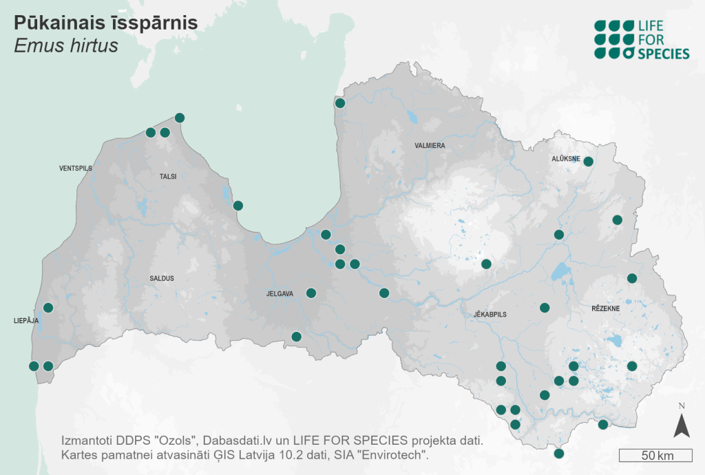 Summary. Maid of Kent beetle – Emus hirtus. It is a species of Western Europe and Asia, occurring from the Iberian Peninsula to Central Asia and from Sweden to the Mediterranean region (Smetana 2004). Latvia is situated in the northern part of the species’ range and is not isolated from other regional populations. In Latvia, the species is found scattered throughout the country (Telnov, Kalniņš 2003; Telnov et al. 2005, 2006, 2008; Cibuļskis 2007; Barševskis et al. 2008). The EOO is 71,739 km2, and the AOO is 140 km2. It is possible that the species is more widespread in suitable habitats in Latvia, thus the potential AOO is at least five times higher. Studies on the size, status and changes of the Latvian regional population have not been carried out. There are no known cases of mass reproduction of this species, as the beetles do not form groups. The population density in all localities in Latvia is relatively low. It is scarce throughout its range in Europe (Biel et al. 2014). It is a thermophilic species that inhabits pastures, wooded meadows and grasslands with scrub vegetation in Latvia and elsewhere in Europe, mostly on sandy or clayey soils (Biel et al. 2014). Both adult beetles and larvae are found on fresh horse and cattle dung, where they feed mainly on dung beetles of the subfamily Aphodiinae and adult beetles of the genus Sphaeridium, as well as the larvae of various flies. The beetles sometimes visit succulent deciduous trees. Threats in Latvia have not been studied and are unknown. In Europe, habitat changes and degradation (overgrowth of grasslands) are mentioned as the main threats, including fertilisers widely used in agriculture, as well as changes in the fauna of the food base – coprophagous insects – and the decrease in their number, caused by the anthelmintics used in animal husbandry. The species has been assessed as Data Deficient (DD) because the main threat to the Latvian regional population is unknown. It is included in the 2nd edition of the Red Data Book of Latvia (Ozoliņš 1998), but the species is not included in international and national regulatory acts. There is no need to revise its current protection status in Latvia. Less than a quarter of the known localities are in protected areas: the “Lubāna mitrājs” and “Vītiņu pļavas” Nature Reserves, the Slītere National Park, and the “Pape”, “Silene”, and “Dvietes paliene” Nature Parks.