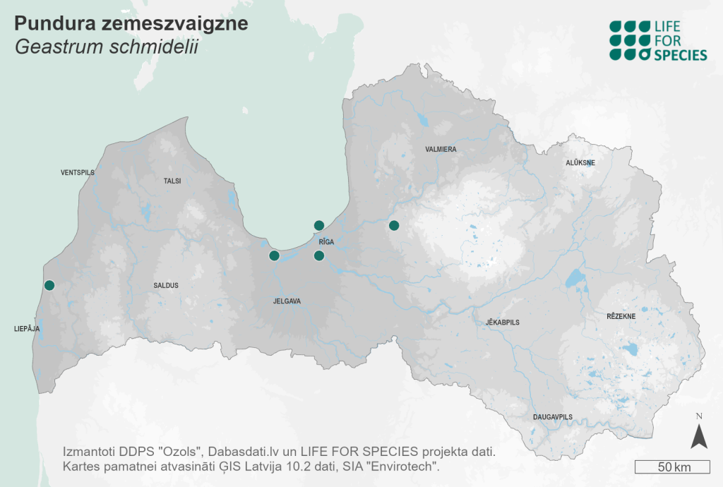 Summary. Dwarf earthstar – Geastrum schmidelii. Found in Europe, Asia, North America, Central America, Australia, and Africa. It is widespread in Europe, reaching southern Scandinavia and Estonia in the north, but rare in Latvia, with seven known localities, mainly in the coastal area and around Riga and Sigulda. The EOO is 28,000 km2, and the AOO – 28 km2. There are insufficient data on the size and changes in the regional population. The number of mature individuals is probably below 30. It is a saprotrophic species found in dry pine forests on sandy soils, coastal and inland dunes. In Latvia, it is also found in dunes in Riga. The species is threatened by the degradation of pine forests on sandy soils and dunes, including anthropogenic impacts such as intensive trampling. It is assessed as Vulnerable (VU) due to its very small regional population. The species is not listed as a species of EU importance and is not protected in Latvia. It has been proposed to be included on the list of protected species in Latvia. About one-third of the regional population is in protected nature areas, e.g. the Ķemeri National Park, the “Ziemupe” Nature Reserve, etc. The conservation measures are mainly related to the protection of suitable habitats, with special attention to the ground cover and its preservation. Research is needed on the distribution, ecology and threats to the species.