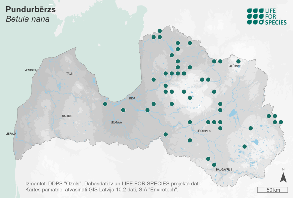 Summary. Dwarf birch – Betula nana. It is relatively rare in Latvia – found in the central, northern and eastern parts of the country. The AOO is 264 km2, and the EOO – 33,142 km2. In Latvia, the EOO and the AOO have decreased during the last 100 years, as the species is extinct in several localities, or the area of suitable habitats has decreased due to peat extraction and forest drainage. There are about 50 localities in Latvia. The size of subpopulations varies from a few individuals to large stands of several hectares. The populations regenerate vegetatively, as individuals do not produce viable seeds. The oldest individual identified so far is 101 years old. B. nana grows in transitional mires, raised bogs and bog woodlands. The main threats are changes in the hydrological regime, peat extraction and climate change. Approximately a third of the population occurs in protected areas, e.g., the Teiči Strict Nature Reserve, the Gauja National Park, the “Ogres Zilie kalni” Nature Park, the “Lielie Kangari”, “Cenas tīrelis”, “Kinkausku meži”, “Ziemeļu purvi”, “Kārķu purvs”, “Gulbju un Platpirovas purvs”, “Klešniku purvs”, and “Kreiču purvs” Nature Reserves. The main necessary protection measures are preventing drainage effects and damage to the species’ localities due to peat extraction.