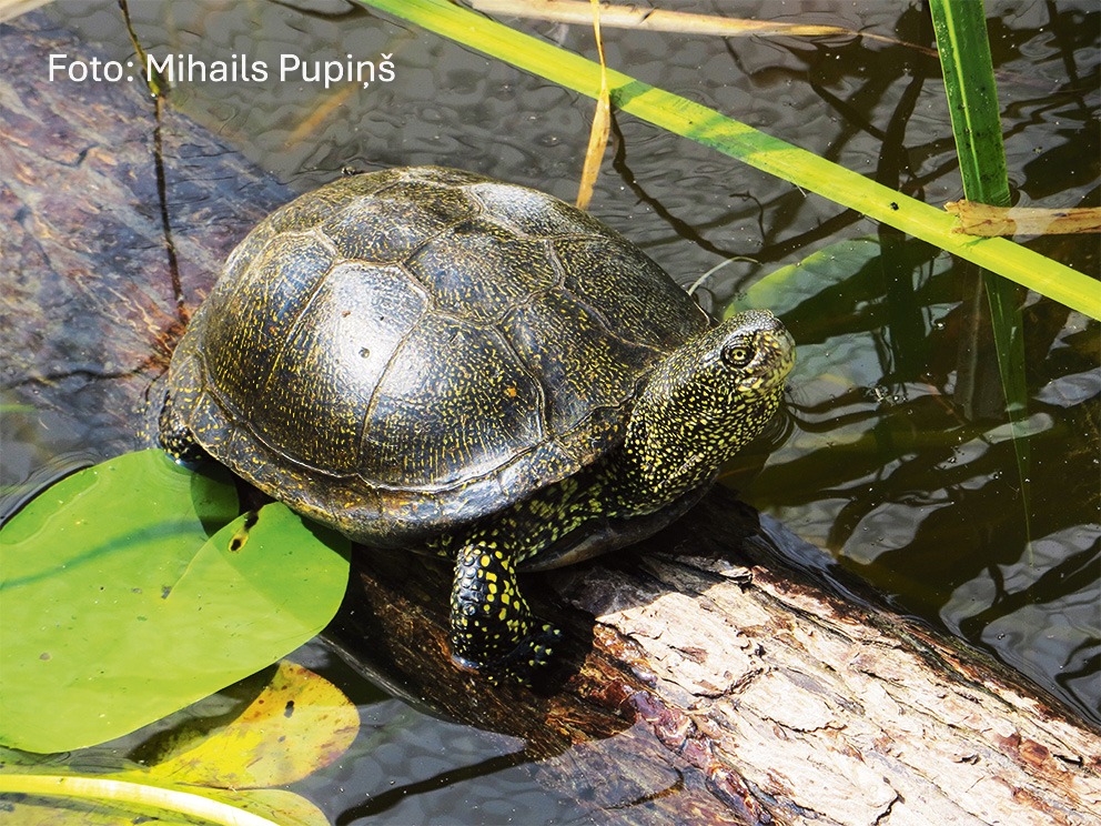 Summary. European pond turtle – Emys orbicularis. The species has a relatively wide distribution in Europe, from the Iberian Peninsula to the European part of Russia and western Asia. Despite a relatively large number of reports of individuals in Latvia, only two sites are currently known where groups of individuals have been recorded – the “Silene” Nature Park (south-eastern Latvia) and the Apgulde surroundings (southern Latvia). The most important of these is the subpopulation in the “Silene” Nature Park, where a reintroduction programme has been underway since 1995. The programme includes habitat improvement and supplementing the population with captive-bred individuals. The total regional population is less than 50 individuals and is expected to decline steadily. It is therefore assessed as Critically Endangered (CR). The AOO is 20 km2, and the EOO – 219 km2. The species inhabits water bodies of various sizes, usually small, with well-developed vegetation and sunlit banks. The species is threatened by introduced species (for example, Nyctereutes procyonoides), nutrient run-off from agricultural and forestry land (causing eutrophication and overgrowth of water bodies), fishing (by traps and nets), roads and railways (lack of animal crossings). It is a species of EU importance and protected species in Latvia, for the conservation of which micro-reserves can be established. The legal status of the species needs to be maintained. The species conservation plan has been developed in 2007, but it needs to be updated. Further conservation measures are described in the nature management plan of the “Silene” Nature Park. Habitat and population restoration has been initiated under several state-funded and LIFE projects, and species are bred and released by the Latgale Zoo. Habitat improvement measures include the creation of new water bodies and the restoration of existing ones, the creation of sunbathing and egg-laying areas, as well as population enhancement measures – supplementing the population with captive-bred individuals.