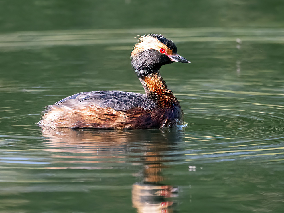 Morfoloģija un bioloģija. Neliels, apmēram krīkļa lielumā. Vasarā apspalvojums tumšs, galva melna, kakls sarkanbrūns. Galvas sānos saglaustu, pagarinātu, oranžu spalvu pušķi. Acis sarkanas. Pēcriesta tērps pelēcīgāks. Galvas virsa melna, pazode un galvas sāni balti. Ne tik piesardzīgs kā mazais dūkuris, biežāk redzams atklātā ūdenī. Pārtiek no ūdens bezmugurkaulniekiem un sīkām zivtiņām. Starp virsūdens augu stublājiem no ūdensaugiem būvē peldošu ligzdu. Dējumā 3–8 olas. Mazuļi ligzdbēgļi. Gājputns, ziemo Eiropas R un D daļā (LOB 1999).