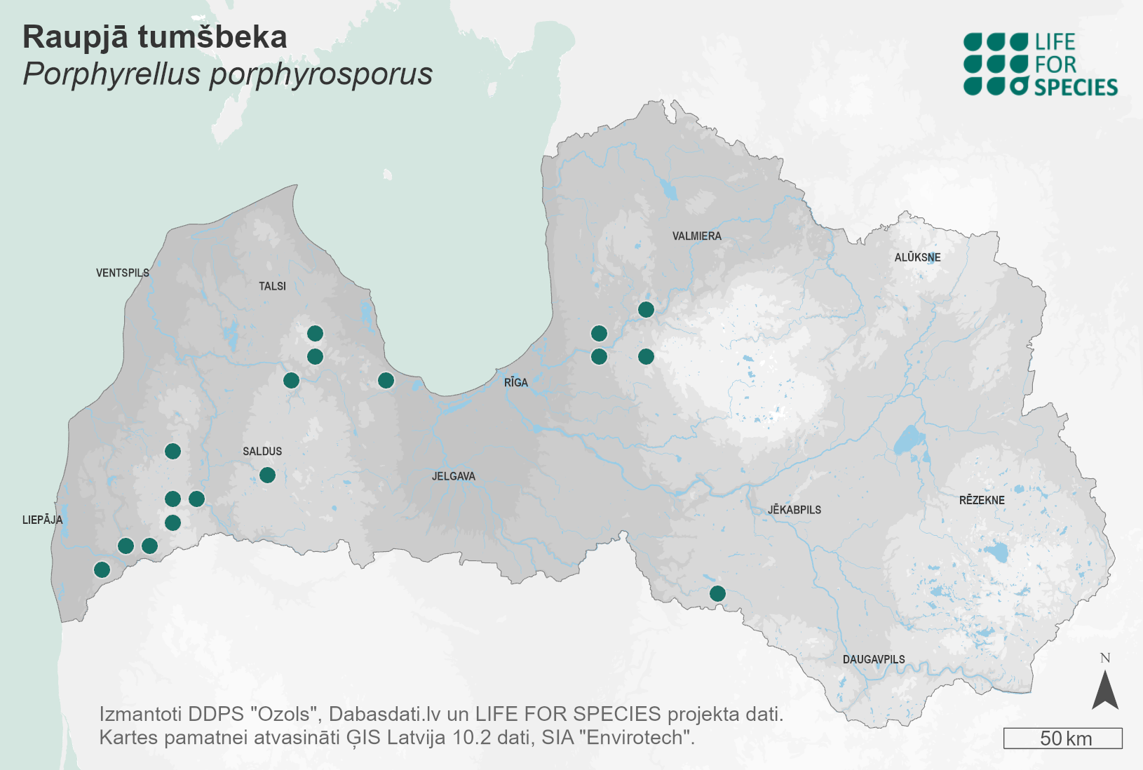 Summary. Dusky bolete – Porphyrellus porphyrosporus. Found in Europe, North America, East Asia, and Australia. It is rare in Europe, in temperate and hemiboreal zones. It is rare in Latvia; currently 22 localities are known, mainly in Western Latvia. The EOO is 23,548 km2, and the AOO – 88 km2. No information is available on distribution changes due to a lack of studies; insufficient data on the regional population size and changes. The number of mature individuals probably does not exceed 1,000. It is mycorrhizal with deciduous trees (oak, lime, beech, hazel). In Europe, it grows in deciduous and mixed forests on acidic soils. In Latvia, it is found in a variety of deciduous, mainly old forests. The main threat is the decline in the proportion of old deciduous forests. It is assessed as Vulnerable (VU) due to a small regional population. It is a protected species in Latvia; its legal status for protection may be reviewed. About half of the localities are in protected nature areas – the Gauja National Park, the “Talsu pauguraine” and “Abavas senleja” Nature Parks, the “Dunika” and “Ruņupes ieleja” Nature Reserves. Research is needed on the size, distribution and trends, life cycle and ecology of the Latvian regional population.