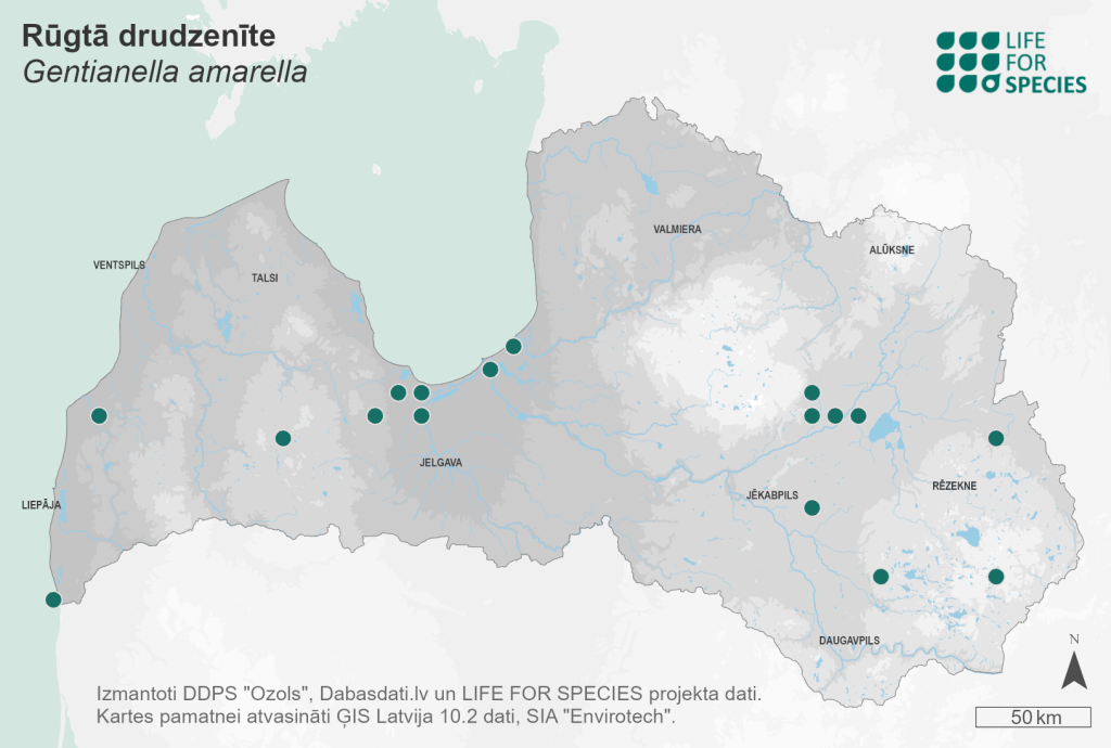Summary. Autumn gentian – Gentianella amarella. It is rare in Latvia; over the past 30 years the species has been found in only 16 localities, and it may have disappeared from many sites. The AOO is 76 km2, and the EOO – 34,760 km2. In Latvia, no studies have been conducted on its distribution, population size and trends. The condition of species’ localities after 1991 is unknown; it is probably extinct in many of them. Since no targeted inventory has been carried out, the species may have survived in some sites. The species is found in dry and moderately moist meadows, pastures, scrub, on forest roads and roadsides. Most often, it grows in places with sparse vegetation. The frequency of G. amarella is decreasing mainly due to drainage, ploughing up, amelioration and overgrowing of semi-natural grasslands. The species has been found in several protected areas: the Ķemeri National Park, the Rāzna National Park, and the “Piejūra” and “Kuja” Nature Parks. Many of the species’ localities occur outside protected areas. For the conservation of G. amarella, previously recorded localities should be surveyed, and the population size, distribution dynamics and threats clarified. It is necessary to ensure the conservation of habitats suitable for the species – semi-natural grasslands – by their appropriate protection, restoration and maintenance. Microreserves for the species’ conservation should be established outside protected areas.
