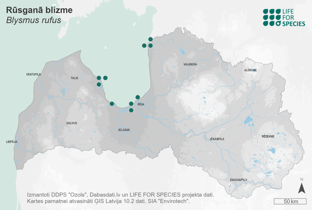 Summary. Saltmarsh flat-sedge – Blysmus rufus. A rare species in Latvia, found on the coast of the Gulf of Riga. The EOO is 4,459 km2, and the AOO – 48 km2. There is no data on the population size. The area and condition of the suitable habitats tend to decline; therefore, the population is shrinking. B. rufus is a coastal species, a halophyte that grows in brackish or saline wetlands. It is often found in plant communities with Agrostis stolonifera, Glaux maritima, Juncus gerardi, Plantago maritima, Triglochin palustre and T. maritima. In Latvia, B. rufus is mainly found in coastal grasslands and floodplains around the river mouths. The threats are degradation and transformation of ecosystems due to cessation or inappropriate grassland management, expansion of built-up areas, invasive and expansive plant species, natural succession that leads to overgrowing with tall herbs, shrubs and trees. Data on the distribution of this species are mostly from the 1990s. Only a few sites have been surveyed within the period of the last 10–20 years. Approximately 70% of the localities are in protected areas: the “Randu pļavas” Nature Reserve, the “Engures ezers” and “Piejūra” Nature Parks. The limiting factor in the distribution of the species is the lack of suitable habitats. Effective restoration and maintenance of semi-natural coastal grasslands is necessary. When updating site management plans for protected areas, the B. rufus populations, the suitable habitats and their conditions should be considered in planning and implementation. The population size should be estimated, and monitoring should be carried out.