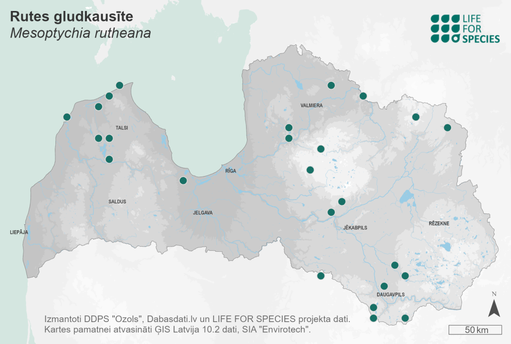 Summary. Fen notchwort – Mesoptychia rutheana. The liverwort is found in northern Europe and the Arctic, also in Asia and North America. It was first found in Latvia by K. Starcs in 1942. Over the last 50 years, it has been found 28 times, scattered over most of the country. EOO is 47,324 km2, and AOO is 112 km2. In Latvia, the size and trends of the regional population have not been studied, but several new species localities have been discovered in recent years. In Latvia, the species grows in nutrient-rich transition mires and quaking bogs. It is threatened by changes in mire hydrology (both drying and flooding), which can lead to the degradation of mire ecosystems or even the disappearance of suitable habitats. In Latvia, the species is assessed as Vulnerable (VU) due to its small AOO and the predicted ongoing decline in both AOO and habitat quality. It is a protected species in Latvia, and its legal protection status must be maintained. Species localities are found in several protected nature areas – the “Aizdumbles purvs”, “Ances purvi un meži”, “Bednes purvs”, “Pelcīšu purvs”, “Sedas purvs”, “Vesetas palienes purvs” Nature Reserves, and other. It is necessary to ensure the protection of species localities and habitats, and to conduct research on population size, distribution, and dynamics.