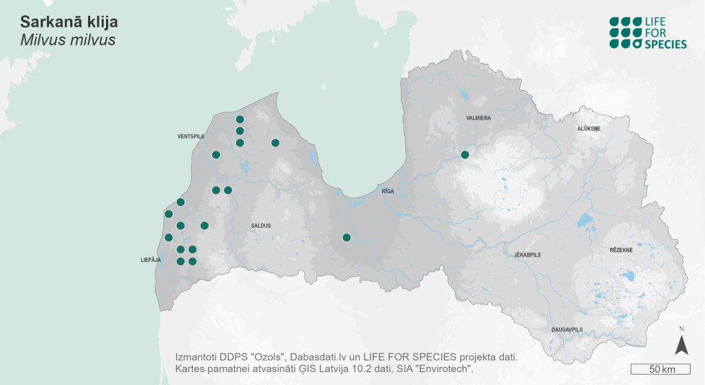 Summary. Red Kite − Milvus milvus. Due to the rare occurrence of the species, a statistical assessment of the changes in its distribution in Latvia is impossible; however, it is evident that the distribution of the species has increased between 2000–2004 and 2013–2017. The AOO of breeding population is 72 km2, the EOO – 17,823 km2. The breeding population is estimated at 7–20 pairs (14–40 adult individuals). The population is increasing in the long term as well as in the short term. The species nests in deciduous and mixed forests near various clearings. Direct poisoning and indirect poisoning (by pesticides and rodenticides) at wintering sites pose significant threats to the species. The species is also threatened by the conversion of grasslands into arable land and the increase in agricultural intensity, which has led to homogenisation of the landscape and growing chemical pollution. The species is threatened by deaths on power lines, roads and, potentially, wind farms as well. The species may also be threatened by competition with the Milvus migrans. The legal status of protected species needs to be maintained in Latvia. Conservation of the species requires the creation of micro-reserves at breeding sites and the conservation of grasslands around them, including by limiting the use of pesticides.