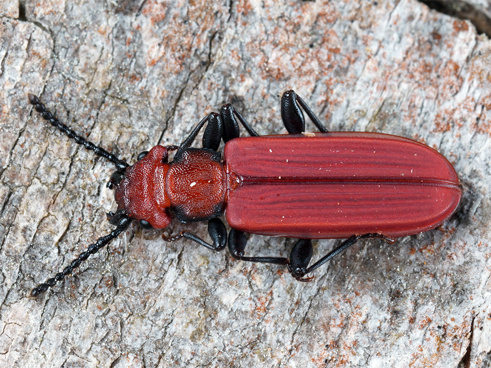 Summary. Flat bark beetle – Cucujus cinnaberinus. The species is widely distributed in Eurasia from northern Spain to central Sweden, southern Finland, and from western Spain to western Kazakhstan. Latvia is located in the north-western part of the distribution range. In Latvia, 22 localities are known. The EOO is 20,427 km2, and the AOO is 48 km2. In Europe, the regional population is increasing, in the boreal region the AOO and the regional population are declining. The state and trends of the Latvian regional population are not precisely known, but it has been concluded that both the AOO and regional population are declining. The species inhabits old-growth mixed broad-leaved and boreal forests dominated by aspen or broad-leaved trees such as pedunculate oak, elm and various species of willows. Larvae develop under the bark of snags and recently fallen trunks. The main threats are the decline of old-growth, mixed, aspen and broadleaved tree-dominated forests and the general decline of decaying wood in forests. Preservation of old-growth mixed and broadleaved forests and the long-term availability of decaying wood in forests are crucial for the protection of the flat bark beetle. Further studies on the distribution, population size, trends and status are required. The species is assessed as Endangered (EN) due to the small AOO and the continuous decline of the AOO and the regional population. It is a species of EU importance and protected species in Latvia, for which conservation micro-reserves can be established. The species’ legal protection status must be maintained.