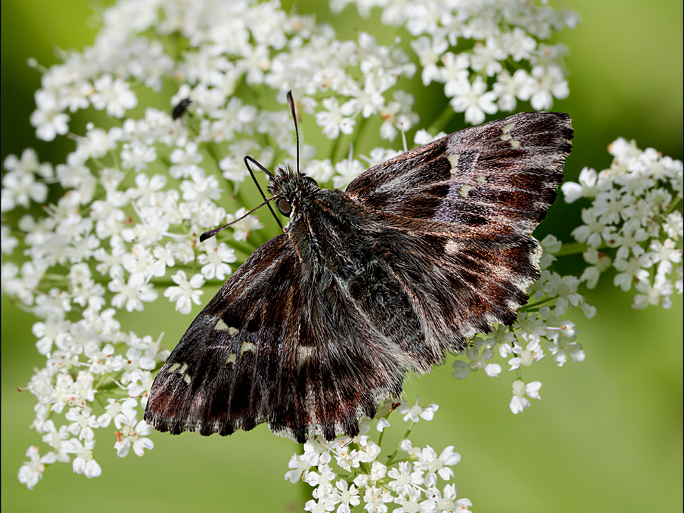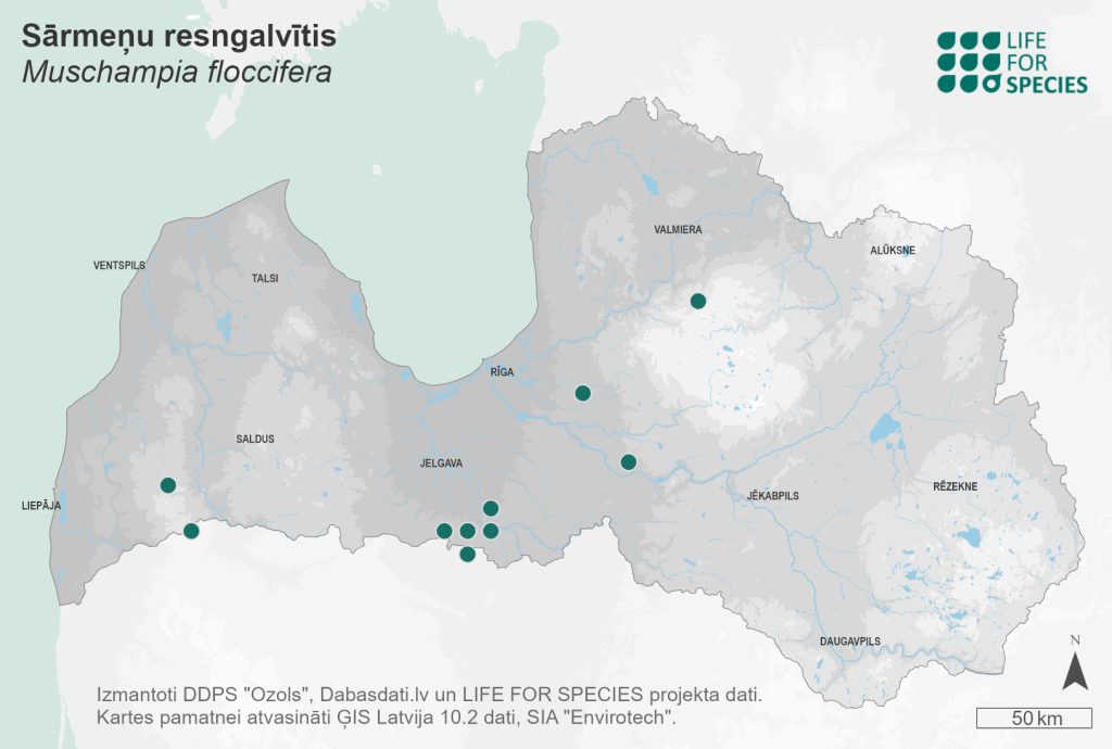 Summary. Tufted skipper – Muschampia floccifera. A transpalaearctic species, distributed from the Iberian Peninsula to southern Siberia in Asia (Haahtela et al. 2011). The species is rather isolated in the Baltic countries from the species’ core range. It is relatively common in Lithuania, but very rare in Estonia (one individual recorded). It has been recorded in Belarus (Ivinskis, Rimšaitė 2018; Pisanenko et al. 2019; Jürivete, Õunap 2020) but not found in Fennoscandia. Latvia is located at the northern limit of its range (Savenkov, Šulcs 2010). The EOO is 11,577 km², and the AOO – 56 km²; according to an expert opinion, the potential AOO is several times higher. Quantitative studies on the size, status and changes in the regional population of the species in Latvia have not been carried out. The species is found in shady mixed forests, forest edges, where its food plants are found. The species is threatened by habitat changes and degradation, e.g. logging and frequent mowing. It is assessed as Near Threatened (NT) due to its very small AOO and the isolation of the regional population from the core range of the species. The species has not been assessed as Vulnerable (VU) according to the EOO, as it is likely to be more widespread than currently known. It is a protected species in Latvia. The legal protection status of the species must be maintained. Conservation should focus on the preservation of habitats in and around the species’ localities (maintenance of the hydrological regime and preservation of forest edges), as well as the search for new localities, education of experts and nature enthusiasts about the species and its habitats.