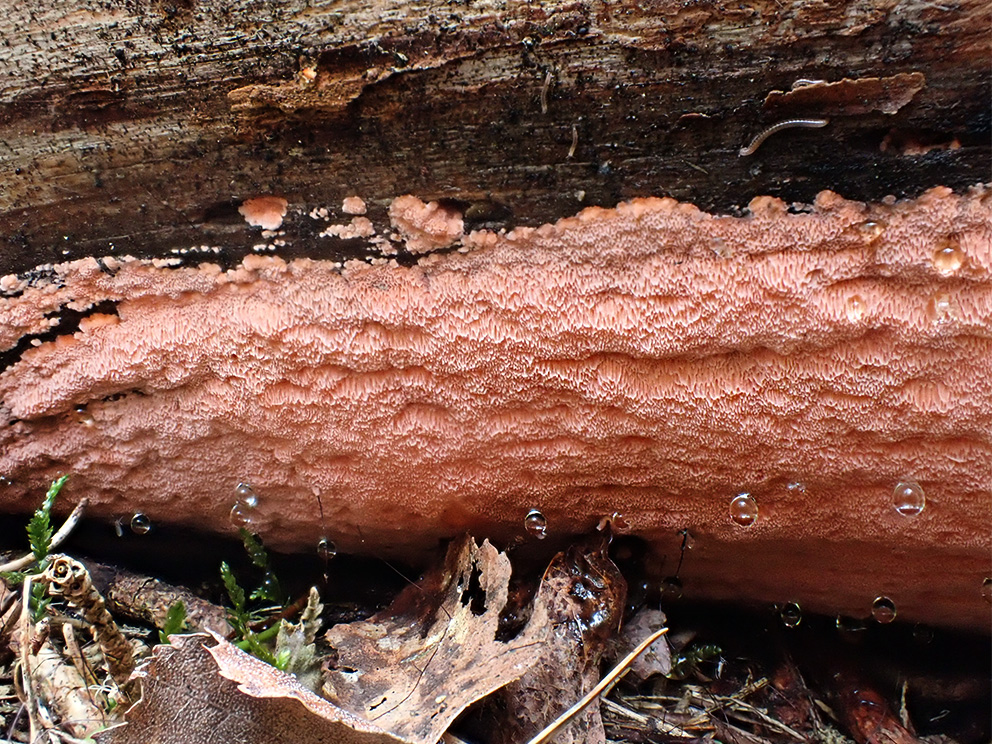 Summary. Pink pancake crust – Rhodonia placenta. Found in Eurasia and North America. In Europe it occurs mainly in the boreal and hemiboreal zones. It is relatively rare in Latvia; about 150 known localities in different regions. The EOO is 63,688 km2, and the AOO – 532 km2. There is a lack of data on the regional population size and changes. The number of mature individuals is about 370. It is a wood saprotroph, causing brown rot. It grows mainly on fallen logs or standing dead trees, and can be found in coniferous forests with a high number of logs. The species is threatened by intensive forestry, decrease of dead wood, especially large diameter dead wood in coniferous forests, and changes in the moisture regime. It is assessed as Vulnerable (VU) due to its small regional population. It is not included in the EU or Latvian lists of protected species. At present, the species does not require legal protection status in Latvia. Approximately 47% of the regional population is located in protected nature areas – the Krustkalni Strict Nature Reserve, the Gauja National Park, and the “Vjadas meži” Nature Reserve. The conservation of the species requires the continuity of dead wood. It is necessary to preserve the large old conifers in the forest and to maintain the natural cycle of wood decomposition under suitable conditions of shade and humidity for at least a part of these trees or at least part of the area. Research is needed on the occurrence, ecology and threats to the species.