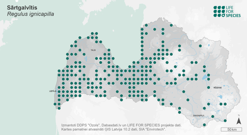 Summary. Common Firecrest − Regulus ignicapilla. The first breeding record of the 20th century in Latvia was registered in 1994, which was followed by an increase in the distribution. The AOO of the breeding population is 1,652 km2, the EOO – 74,615 km2. The breeding population is estimated at 350–1,600 pairs (700–3,200 adult individuals) and growing. The species inhabits various forests, as well as ornamental plantations, parks and cemeteries. Given the population growth, no significant threats are currently present, but logging has the potential to have a negative impact. The legal status of the species does not need to be changed in Latvia. The species does not currently require special conservation measures.