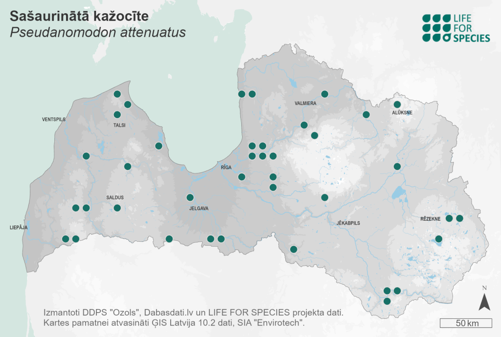 Summary. Slender tail-moss – Pseudanomodon attenuatus. In Europe, the moss species is known in the northern, central and south-east regions, and is much rarer in the south and west. Elsewhere, it is found in Central and North America and parts of Asia. It was first found in Latvia by G. Girgensohn in 1860. The species has been recorded in more than 80 localities over the last 50 years. It is found scattered throughout the country. EOO is 55,904 km2, and AOO is 220 km2. The size and trends of the regional population have not been studied in Latvia, but the number of recorded localities has recently increased. It is mainly associated with spruce and broadleaved forests and river valleys, where it grows on both the bases and trunks of trees (elm, maple, lime, aspen, ash, oak, willow), fallen trees, and on shaded granite stones and dolomite. The species is threatened by clear-cutting in moist spruce-fir and broadleaf forests and forests in river valleys. It is assessed as Near Threatened (NT) as subpopulations of the species are currently stable, but the situation may change if more localities are destroyed and the area occupied by the species declines. The species should be included on the list of protected species of Latvia. The species has been found in several protected nature territories – the “Jaša”, “Lubāna mitrājs” and “Pildas ezera salas” Nature Reserves, the Gauja, Ķemeri, Rāzna and Slītere National Parks, the “Ogres ieleja” Nature Park, and the “Augšdaugava” and “Ziemeļgauja” Protected Landscape Areas. Protection of the localities of the species and studies on the population size, distribution and dynamics should be carried out.