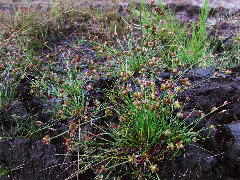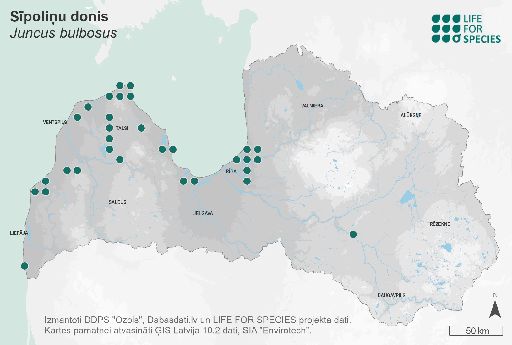 Summary. Bulbous rush – Juncus bulbosus. In Latvia, the species is found mainly in the Coastal Lowland. In the past, some localities in south-eastern and north-eastern Latvia were recorded. The largest known subpopulations occur in the “Ādaži” Protected Landscape Area, the “Ziemupe” Nature Reserve and the Slītere National Park. The EOO is 29,845 km2, and the AOO – 268 km2. It grows in wet heaths, in moist and wet forest road depressions, on bare peat in fens, and less frequently on sandy lake shores of nutrient-poor lakes and in their littoral zone. The plants can form patches of several square meters in size. The population size and dynamics are not known. Many sites host small subpopulations with a few individuals. The main threat is extended drought in the vegetation period. Eutrophication is a threat to its subpopulations in lakes. The largest known subpopulations occur within protected areas. The sites with species records in the past should be surveyed, and the population size in the country should be estimated. The input of nutrient-rich waters into lakes should be prevented.
