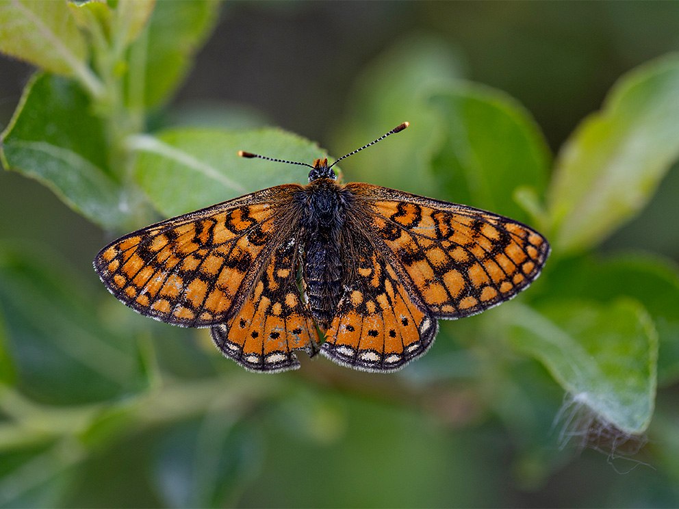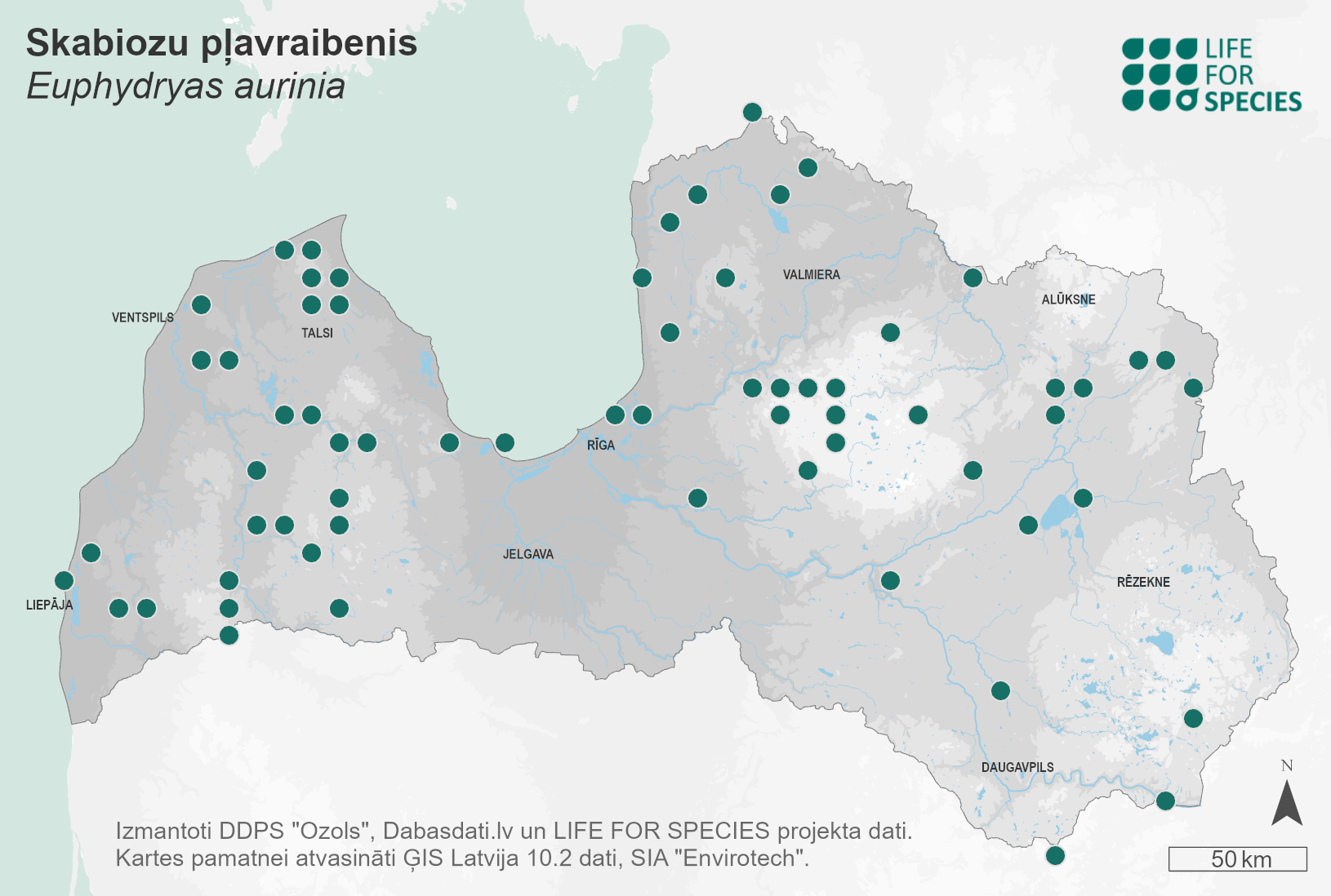 Summary. Marsh fritillary – Euphydryas aurinia. A transpalaearctic species, distributed throughout most of Europe except its northern part. Widespread in Asia, the Russian Far East and China. It is found in Latvia’s neighboring countries. Latvia is in the core of its range and is not isolated from other regional populations. The species is distributed throughout the country, occurring locally and rather rarely, while in some places it is common, e.g. in Western Latvia in Vītiņi Grasslands and Čužu Swamp (Savenkov, Šulcs 2010). In many places the species has been extinct since the 1970s, e.g. near Riga in Garupe. The EOO is 60,784 km², and the AOO – 308 km². The potential AOO is assumed to be several times higher. There are no quantitative studies on the regional population size and its changes in Latvia. The species prefers a variety of wet habitats – grasslands (often on calcareous soils), forest openings, overgrown clearcuts and, less frequently, mire edges. The species is dependent on the presence of its food plant – Succisa pratensis. Threats are related to habitat modifications and degradation – overgrowth, intensive mowing and overgrazing, changes in the hydrological regime (drainage). The species is assessed as Endangered (EN) as it has disappeared from many localities and the suitable habitat area has been steadily decreasing. It is a species of EU importance and protected species in Latvia; micro-reserves can be established to conserve its habitats. The legal status of the species must be maintained. Conservation of the species should focus on active protection of existing localities – their management and restoration (maintenance of the hydrological regime, preventing immoderate overgrowth), ensuring optimal amount of food plants. Further conservation planning of the species requires research on the size, distribution and trends of the Latvian regional population, as well as on threat factors.