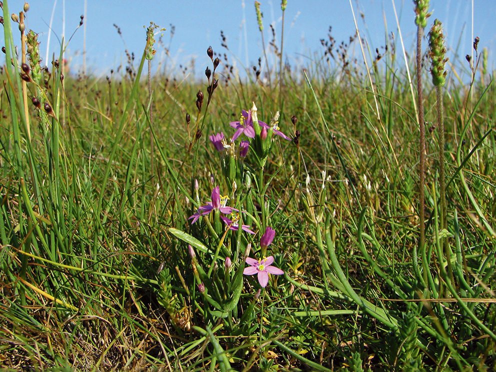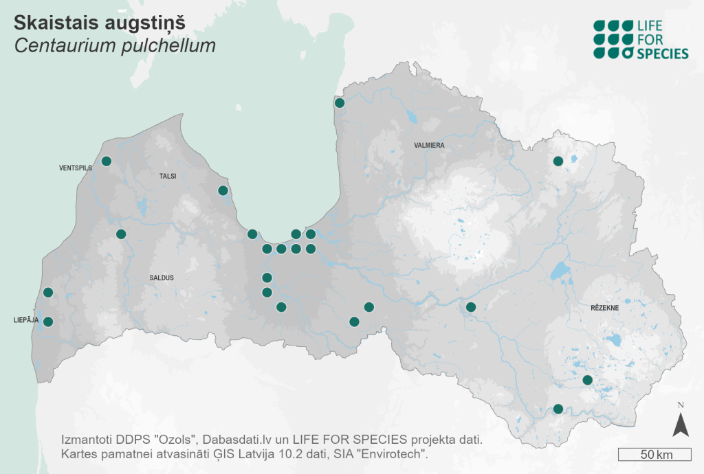 Summary. Lesser centaury – Centaurium pulchellum. It is rare in Latvia, found mainly in the Coastal Lowland and in the central part of Latvia, although some localities are recorded elsewhere. The EOO is 54,555 km2, and the AOO – 128 km2. The EOO has increased slightly compared to what was previously known, but this is due to the more intensive floristic inventories. The population size and its dynamics have not been studied. The number of individuals per site varies from a few to several hundred. The species has been found in coastal grasslands, wet grasslands on soils with fluctuating water tables, grey dunes, river floodplains on gravel soil, gravel pits, along railways, and places with sparse vegetation, e.g., dirt roads. The species is affected by a lack of grassland management, and, like other wetland species, it is also threatened by climate change, prolonged drought during the vegetation season, which can inhibit plant germination and development. The lack of soil disturbance can also reduce the distribution of the species and threaten its existence. C. pulchellum is an annual plant and a poor competitor that requires open soil for seed germination. The species’ localities are located both in and outside protected areas. It is found in the Ķemeri National Park, the “Randu pļavas” and “Liepājas ezers” Nature Reserves. It is necessary to study the distribution of the species and the population size. For the conservation of this species, it is necessary to ensure slight soil disturbance in the places of the richest subpopulations, as well as grassland restoration and management where the species is found in grasslands. The priority is to preserve the species in natural and semi-natural habitats.