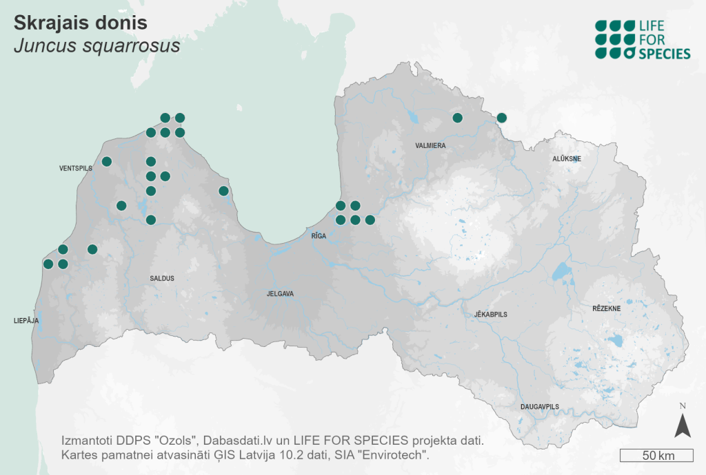Summary. Heath rush – Juncus squarrosus. It is rare in Latvia, mainly found in the western part of the country; most of the localities occur in the Coastal Lowland, and a few of them in eastern Latvia. The EOO is 18,476 km2, and the AOO – 240 km2. The EOO has not changed compared to what was previously known. The lack of new data from south-western Latvia could be explained by the fact that the species is not protected in Latvia and, therefore, insufficient attention has been paid to it. There is little recent data from outside the Coastal Lowland after 1991. The AOO could be larger than is currently known (larger than 500 km2); therefore, it is assumed that it corresponds to the VU category. About 120 observations of the species have been recorded, mainly from western Latvia. The number of individuals at each site is small – a few to a few dozen plants. The species grows in raised bogs, wet heaths, both on peat and wet mineral soils. It has also been found on trails and old forest roads in pine forests. J. squarrosus is found in acidic soils and is a weak competitor that grows in sparse vegetation. The species is threatened by the draining of bogs and forest massifs, and possibly also by the lack of topsoil disturbance. Most of the known localities are situated in protected areas, but this could be explained by the greater research intensity there. A significant percentage of the population occurs in the “Ādaži” Protected Landscape Area and the Slītere National Park. It is necessary to conduct studies on the species’ distribution and its population size. It is important to survey those sites for which there is no data after 1991. Drainage of the species’ habitats should not be permitted.
