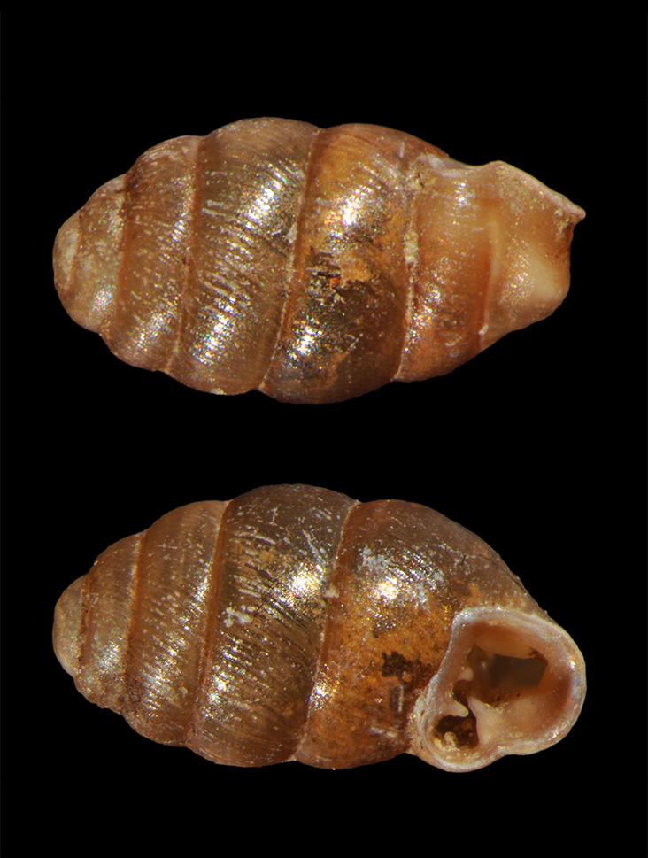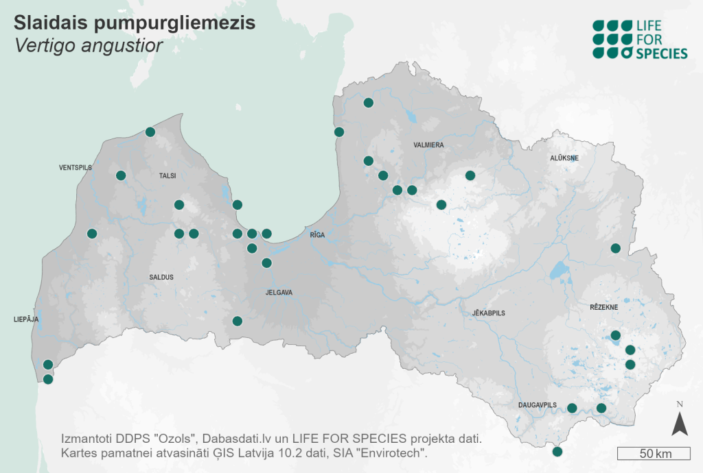 Summary. Narrow-mouthed whorl-snail – Vertigo angustior. A species with a wide distribution range in Europe, from the southern Scandinavian Peninsula to the Mediterranean and from the British Isles to the Caspian Sea. Its distribution is severely fragmented in Latvia, and the species is relatively rare. More than 40 localities of the species are known. The EOO is 67,211 km2, and the AOO – 136 km2. Overall, the regional population is stable, although it has declined in some areas over the last 15–20 years, mainly due to inappropriate habitat management. The species usually inhabits floodplain grasslands, wet depressions, springfens and fens. It is mostly found in the litter layer or in damp moss. It is important that the habitats and their surroundings have unaltered site hydrology and appropriate vegetation composition and structure. The main threats are modification of site hydrology affecting groundwater or surface water in or near habitats, intensive grazing, annual mowing, and in some places the spread of invasive plant species and beavers. Natural factors threatening the species include habitat overgrowth, prolonged drought and heat. The species is assessed as Endangered (EN) based on its severely fragmented distribution and threats from economic activities, as well as considering its small AOO. It is included in the 2nd edition of the Latvian Red Data Book of Latvia (Rudzīte 1998). It is a species of EU importance and is protected in Latvia, for which conservation micro-reserves can be established. The legal status of the species must be maintained. Most of the localities are found in protected nature areas. In the protected natural areas where the species occurs, it is recommended that individual management plans are developed for the species’ habitats. The most appropriate management is extensive grazing. Removal of woody species is recommended where grazing is not possible. Where wild ungulates graze the habitat, cutting or mowing of woody sprouts every few years is sufficient to maintain favourable habitat conditions.
