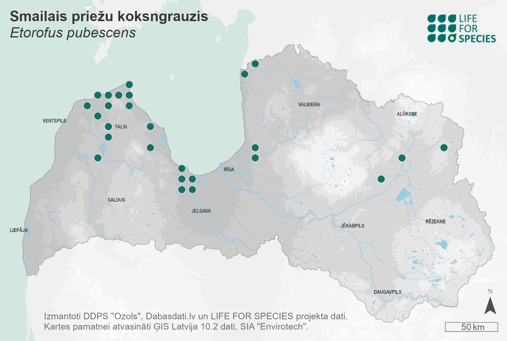 Summary. Longhorn beetle – Etorofus pubescens. The species is distributed in Fenoscandia, the Baltic States, Central and Southern Europe to the Pyrenees in the west and Hungary in the east. Latvia is situated in the northern part of the distribution range. In Latvia, the species inhabits mainly the coastal lowlands, with 42 known localities. The EOO is 26,280 km2, and the AOO is 136 km2. In Europe, the regional population of the species is assessed as stable; however, in the boreal region, the regional populations in most countries are declining. The state and trends of the Latvian regional population are unknown, and it has been concluded that both the AOO and the regional population are declining. The species inhabits old-growth Scots pine forests on sandy or rocky soils, mainly along the coast or on the inland dunes. Larvae develop in sun-exposed, large-sized decaying pines – snags, fallen trunks as well as stumps. The main threats are the reduction of the area of old, open pine stands and the general decline of decaying wood in forests, as well as the reduction of the area and intensity of fires. Preserving old-growth, open Scots pine forests and decaying pine wood is crucial for the species. It is necessary to carry out management measures suitable for the species, for example, introducing controlled burning. It is necessary to raise public awareness and educate stakeholders about controlled forest burning as an appropriate management activity to artificially expand suitable habitat for several rare and endangered, fire-dependent species. Further studies on the distribution and regional population trends of the species are required. The species is assessed as Vulnerable (VU) due to the small AOO and the continuous decline of the AOO and the regional population. It is not a species of EU importance and is not protected in Latvia. It is proposed to include E. pubescens on the list of protected species in Latvia.