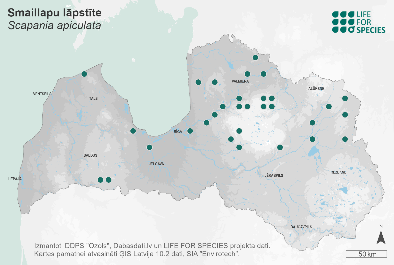 Summary. Pointed earwort – Scapania apiculata. The liverwort is registered in Europe in various countries, as well as in Asia and North America. It was first found in Latvia by A. Bruttan in 1890. Today, 57 localities are known for the species, mainly in central and northern Latvia. EOO is 34,874 km2, and AOO is 170 km2. In Latvia, the regional population size and trends have not been studied. In Latvia, it grows exclusively on decaying, old spruce, pine, and aspen, and more rarely on ash, logs in wet, shaded forests. The species is threatened by clear-cutting in suitable wet, old coniferous and mixed forests, and it is negatively affected by forest drainage and watercourse regulation. It is assessed as Vulnerable (VU) due to a predicted continued population decline. It should be included on the Latvian list of protected species as a species for which micro-reserves can be established. In total, 75% of the localities occur in protected nature territories, with one locality in a micro-reserve. The species has been found in the “Zvārde”, “Katlešu mežs”, “Stompaku purvi” and “Lubāna mitrājs” Nature Reserves, the Gauja, Slītere and Ķemeri National Parks, the “Ogres ieleja” Nature Park, and the “Ziemeļgauja” Protected Landscape Area. Some localities outside protected nature territories fall within the restricted zones of watercourses, where clear-cutting is prohibited, but where economic activities may result in insufficient suitable micro-biotopes. Protection of the localities and habitats of the species should be ensured, and studies on the population size, distribution and trends should be carried out.