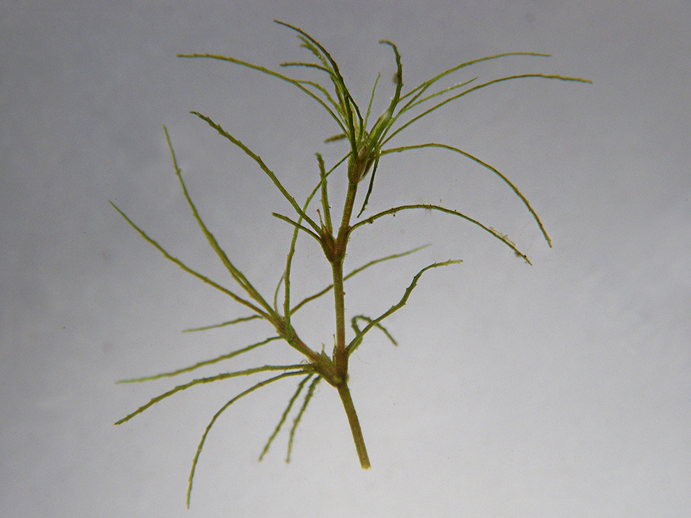Morfoloģija un bioloģija. Viengadīgs 5–30 cm garš ūdenī iegremdēts un gruntī iesakņojies smalks vienmājas ūdensaugs. Stublājs tumšzaļš un ļoti trausls, augšdaļas virzienā stipri zarots, lokans, pavedienveidīgs. Lapas ļoti šauras, lineāras, pamīšus, gandrīz pretējas vai neīstos mieturos, (7) 13–20 mm garas, 0,2–0,3 (0,5) mm platas, ar 8–17 attāliem 1–3 šūnu zobiņiem katrā malā, lapas gals ar diviem zobiņiem, lapas plātne lokveidīgi noliekta. Lapas plātne pie pamata strauji pāriet 3–4 reizes platākā makstī, kuru veido divas apaļīgi nošķeltas un augšdaļā smalki zobainas austiņas. Ziedi viendzimuma, sīki, zaļi, lapu žāklēs. Auglis – ļoti šaurs, eliptisks vai iegareni eliptisks riekstiņš ar vienu sēklu, (2,2) 2,5–2,8 (3,0) mm garš, 0,6–0,8 mm plats, sēklapvalks gluds, spīdīgs, tumšzaļš, sēklu virsmas šūnojums ar 25–30 garenisku, 4–7 reizes garāku prozenhimātisku šūnu rindām, kas stiepjas paralēli sēklas garenasij. Zied jūlijā un augustā (Tzvelev 2000; Suško 2008; Priedītis 2014).