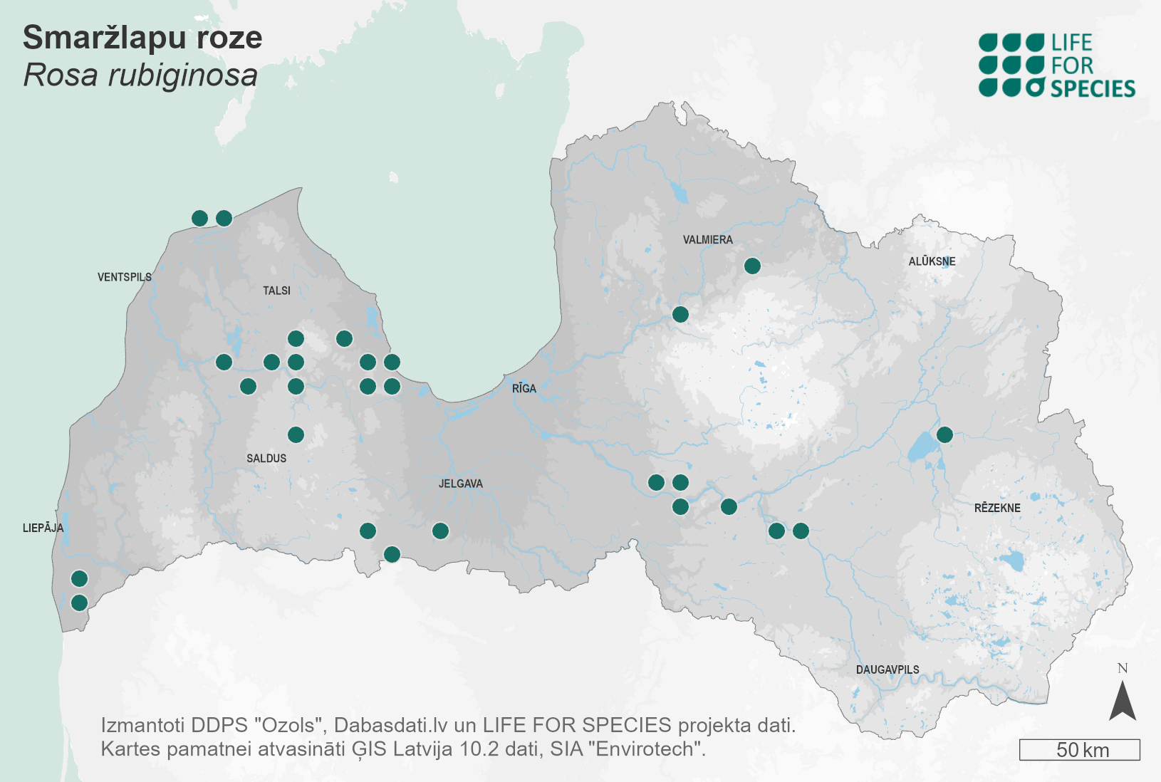 Summary. Sweet-briar – Rosa rubiginosa. In Latvia, this species is rare, with an uneven distribution; mainly found in western Latvia and some localities in the River Daugava Valley, Vidzeme and Zemgale. The AOO is 164 km2, and the EOO – 39,354 km2; currently known from 44 localities. The population size in Latvia is around 350 individuals. The distribution of the species in the regions of intensive agriculture has significantly decreased, while elsewhere in Latvia it has been repeatedly recorded both in the earlier known sites and found in new localities. There is still a potential to find new localities in western Latvia. Due to specific management requirements in suitable habitats – extensive grazing and mowing, preserving individual shrubs and groups or shrubs, the species has survived mainly in linear habitats along roads, forest edges, etc. Very few individuals have survived in suitable grassland habitats. At least 60% of localities occur outside protected areas. The species occurs in the Gauja National Park, the “Talsu pauguraine”, “Daugavas ieleja” and “Abavas senleja” Nature Parks and the “Ovīši” Nature Reserve. The main threats are changes in agricultural practice, grassland abandonment, intensive agriculture and afforestation of semi-natural grasslands (especially dry calcareous grasslands). A survey of the known and potential localities is needed to specify the distribution, population size and its dynamics. The conservation of suitable habitats must be ensured by an appropriate protection regime and management that includes the preservation of individual shrubs and groups of rose shrubs in managed semi-natural grasslands, on roadsides and other ecotones.