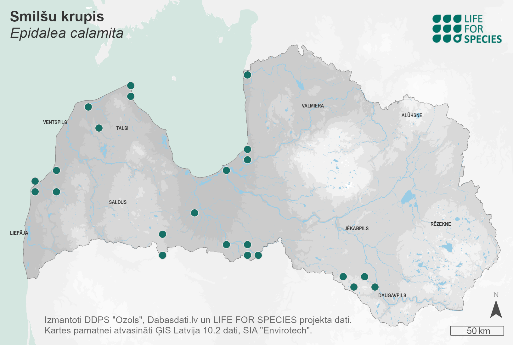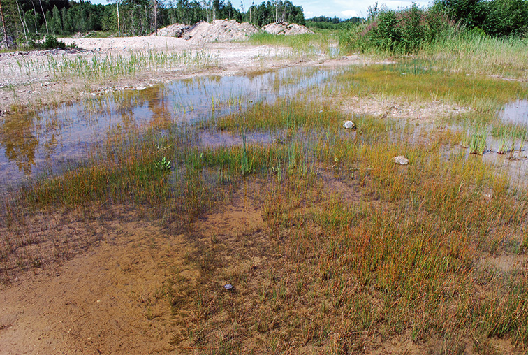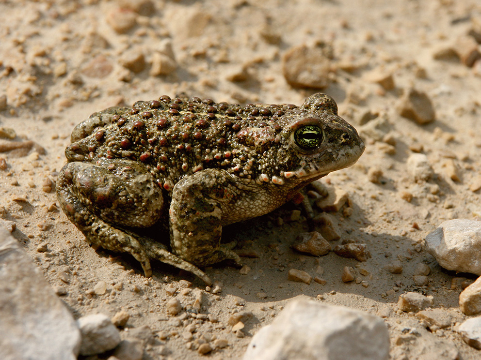 Summary. Natterjack toad – Epidalea calamita. The range of the species covers roughly the Atlantic climate zone of Europe from the Iberian Peninsula and the British Isles (Ireland) to the Baltic region (east of Estonia). Latvia lies at the eastern limit of the species’ range. In Latvia, the species range is highly fragmented, with 5–6 subpopulations remaining from the former two larger subpopulation groups. Each subpopulation is small (usually no more than 50–100 adult individuals) and contains 10–25% of the regional population. The AOO is 144 km2, and the EOO – 37,283 km2. The actual AOO may be even smaller, as it includes sites where the species has not been recorded in the last 15 years. In the past, the species was common within the current administrative boundaries of Riga City. Over the past century, the AOO of the species has declined by at least 51% and the EOO by 17%, with an irreversible distribution break due to the development of Riga. The total size of the regional population is estimated at 1,300–2,400 adult individuals. It occupies open habitats of natural or anthropogenic origin, such as coastal dunes, open heathland, abandoned sand quarries and agricultural land. Light sandy soils in which the natterjack toad can burrow are characteristic of these habitats. The species is very sensitive to dispersal barriers such as road networks with heavy traffic. The long-term persistence of subpopulations is threatened by habitat overgrowth with shrubs and reeds. The impact of anthropogenic factors is unlikely to diminish and further declines in the regional population are expected. The species is assessed as Endangered (EN) because its EOO, range and consequently its regional population are highly fragmented, with a declining trend in both area and regional population size. It is both a species of EU importance and a protected species in Latvia, for the conservation of which micro-reserves can be established. The legal status of the species must be maintained. The necessary research and conservation measures are listed in the species’ conservation plan, which was adopted almost 15 years ago and now needs to be updated. Conservation measures also need to be developed for several protected nature areas. The conservation measures include habitat restoration and maintenance – creating breeding sites and keeping habitats open and free of shrubs and reeds.
