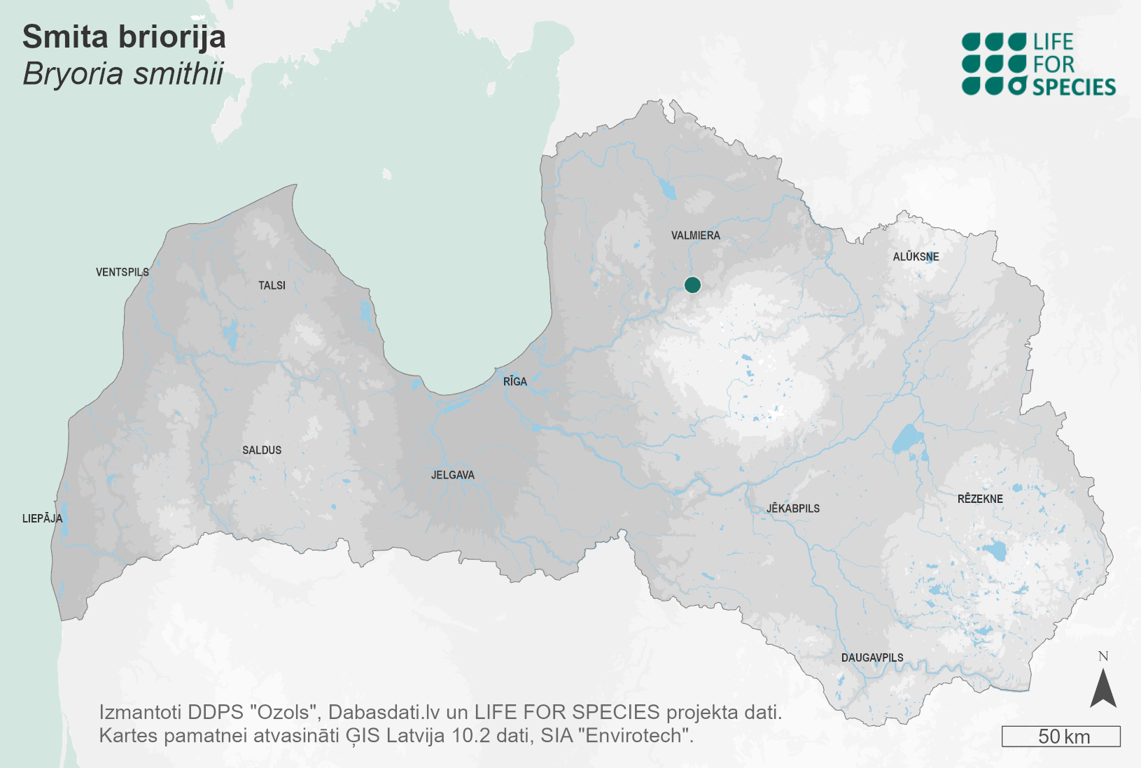 Summary. Bryoria smithii is found in Asia, Northern Europe and, less frequently, in the rest of Europe. In the Baltic states, the species is only known to occur in Latvia. It has only been found in one locality near Cēsis in 2021. The EOO and the AOO are 4 km2. An epilithic species. It has been found in Latvia on a sandstone outcrop in a relatively shaded area of an old coniferous forest. Potential threats to the survival of the species include the development and expansion of tourism infrastructure near sandstone outcrops, as well as landslides of such outcrops. The species is assessed as Critically Endangered (CR) because the number of mature individuals does not exceed 50. The species must be included on the list of protected species, with the possibility of creating micro-reserves for its protection. The only locality is in the Gauja National Park. The localities of the species should be protected, and threats caused by recreation should be addressed, including by diverting tourism infrastructure away from the outcrops inhabited by the species.