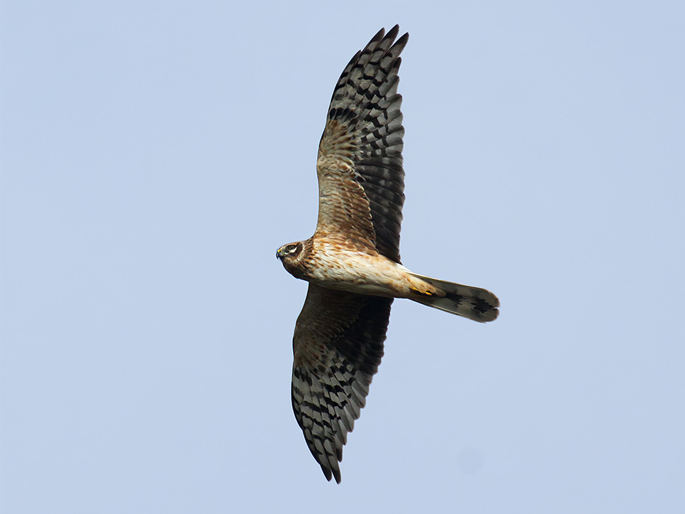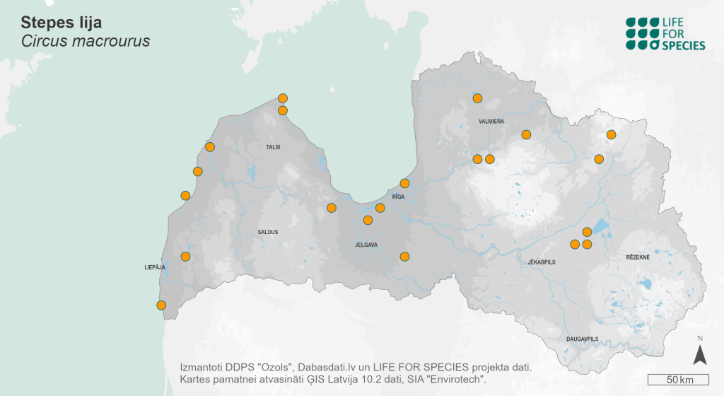 Summary. Pallid Harrier − Circus macrourus. The AOO of the population migrating through Latvia is 104 km2, the EOO – 45,866 km2. The size of the migratory population is unknown, but it is estimated to be less than 50 adult individuals. The population trend is also unknown, but, given the population trends in Finland and Russia, there is no reason to believe that it is declining. Migrating birds can occur in any open landscape. In its breeding range, the species is mainly threatened by the destruction and degradation of steppe grasslands as they are converted to arable land, burning, intensive grazing or removal of shrubs and other tall vegetation. The species needs to be included on the list of protected species of Latvia.