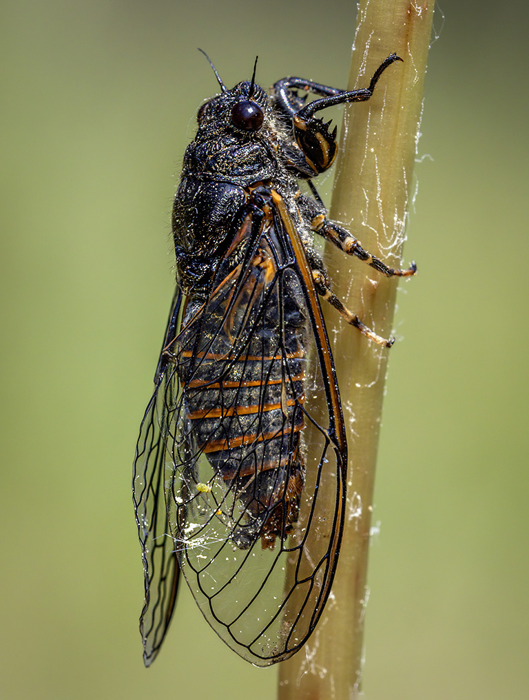 Morfoloģija un bioloģija. Svītrainā cikāde ir 23–28 mm gara, gariem caurspīdīgiem spārniem, ko tā miera pozā tur “jumtveidā” sakļautus virs ķermeņa. Ķermenis ovāls, galva plata un salīdzinoši liela. Labi atšķirama no citām cikāžu sugām, tostarp pēc sugai specifiskas skaņas melodijas (Ossiannilsson 1981). Kāpuri attīstās 4–8 gadus. Pieaugušie indivīdi (imago) ir salīdzinoši labi lidotāji. Nepieaugušie indivīdi (nimfas) pēc izskata ir līdzīgi imago, bet bez attīstītiem abu spārnu pāriem un blāvā krāsā, jo dzīvo augsnē. Nimfas barojas ar dažādu augu saknēm (Ossiannilsson 1981; Söderman 2007; Liivmägi, Tarlap 2017; SLU Artdatabanken 2022).