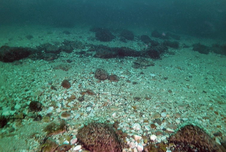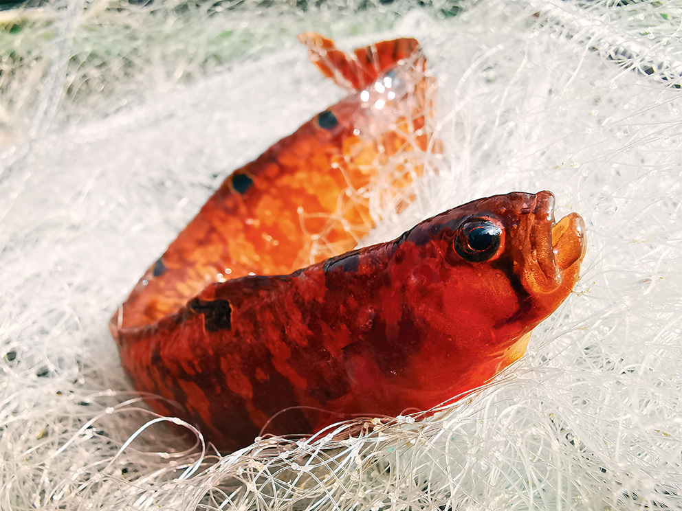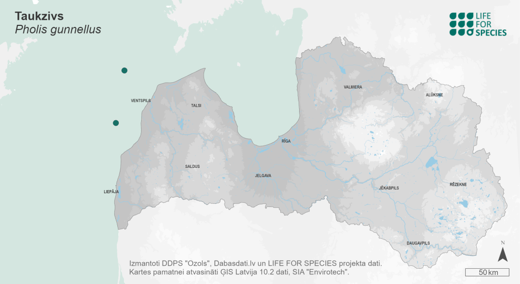 Summary. Rock gunnel – Pholis gunnellus. In Europe, the species is distributed from the Arctic Ocean to the Bay of Biscay in the Atlantic Ocean and adjacent seas, including the Baltic Sea. In the Baltic Sea, it occurs in the Gulf of Finland up to Helsinki and in the Gulf of Bothnia up to 62° N. It is very rare in Latvian territorial waters, with only three observations in the open Baltic Sea, on sand and rocky shoals. The EOO is 6 km2, and the AOO is 8 km2. The current population status is estimated to be stable throughout its range. No specific studies have been conducted to estimate the regional population in Latvian waters, and therefore, no data are available on the regional population size and changes. It is a benthic marine fish found in coastal areas of the Baltic Sea up to depths of 20 m, mostly on rocky seabeds among kelp. The species has no economic importance. There are no confirmed species-specific threats. As the species generally inhabits rocky substrates and is small in size, it is not directly affected by fishing and is rarely bycatched. As there is currently insufficient information to assess the extinction risk of the species in Latvia, it has been assigned the category Data Deficient (DD). The species is not included on the lists of EU importance and Latvian protected species. Monitoring methods customised to detect the species are needed to clarify its distribution and regional population trends. Studies are also needed to determine the area and changes in the species' habitat.