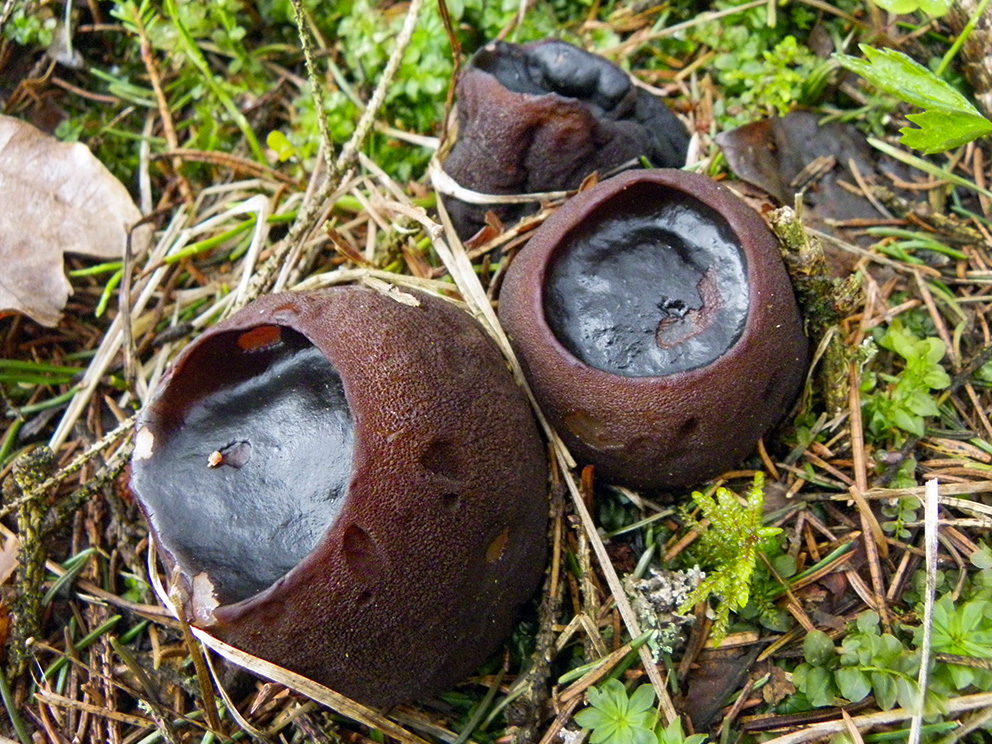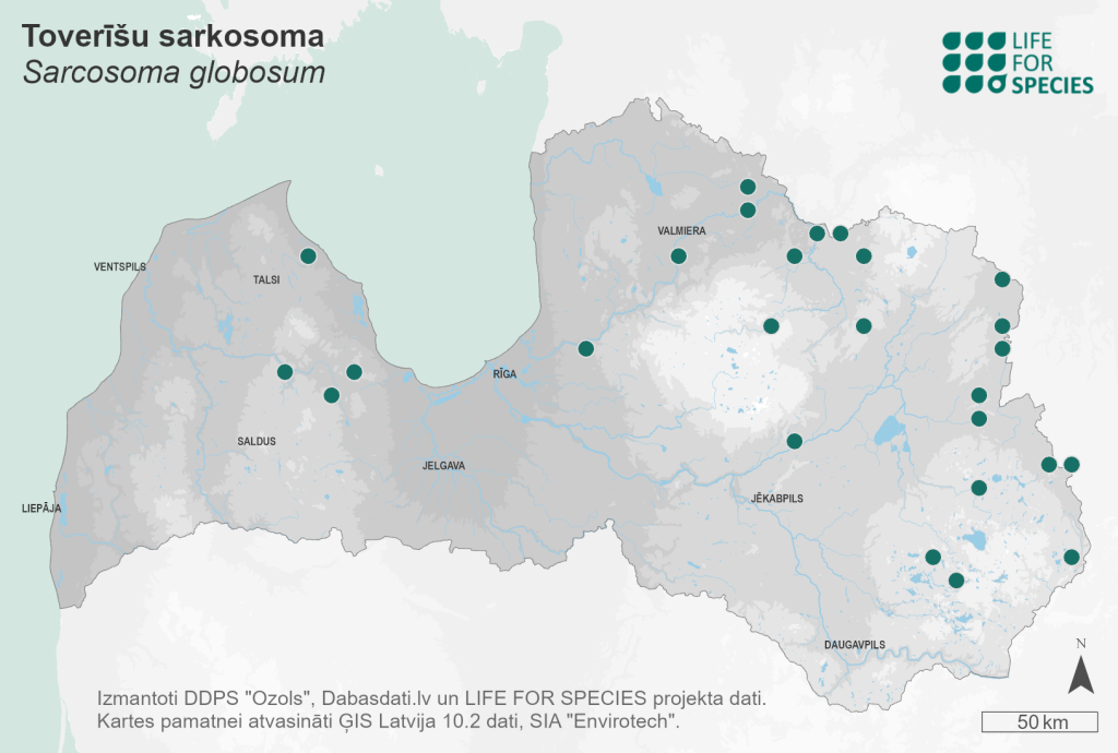 Summary. Charred-pancake cup – Sarcosoma globosum. Distributed across Europe, Asia, and North America, mainly in the boreal and hemiboreal zones. It is rare in Latvia; 23 localities are known in different regions. The EOO is 36,296 km2, and the AOO – 92 km2. There are insufficient data on the regional population size and changes. The number of mature individuals probably does not exceed 1,000. It is a forest litter saprotroph. In Europe, it occurs in old coniferous forests, mainly spruce. In Latvia, it is found not only in old coniferous forests, but also in rather young spruce plantations. It is threatened mainly by logging, and assessed as Vulnerable (VU) due to its small regional population. It is a protected species in Latvia; its legal status of protection needs to be maintained. It is found in protected nature areas, such as the Gauja National Park, and the “Ziemeļgauja” Protected Landscape Area. Most localities are outside protected areas. The conservation of species would require restrictions on clear-cutting in and near the known localities. Studies on the size, distribution and trends, life cycle and ecology of the Latvian regional population are needed.