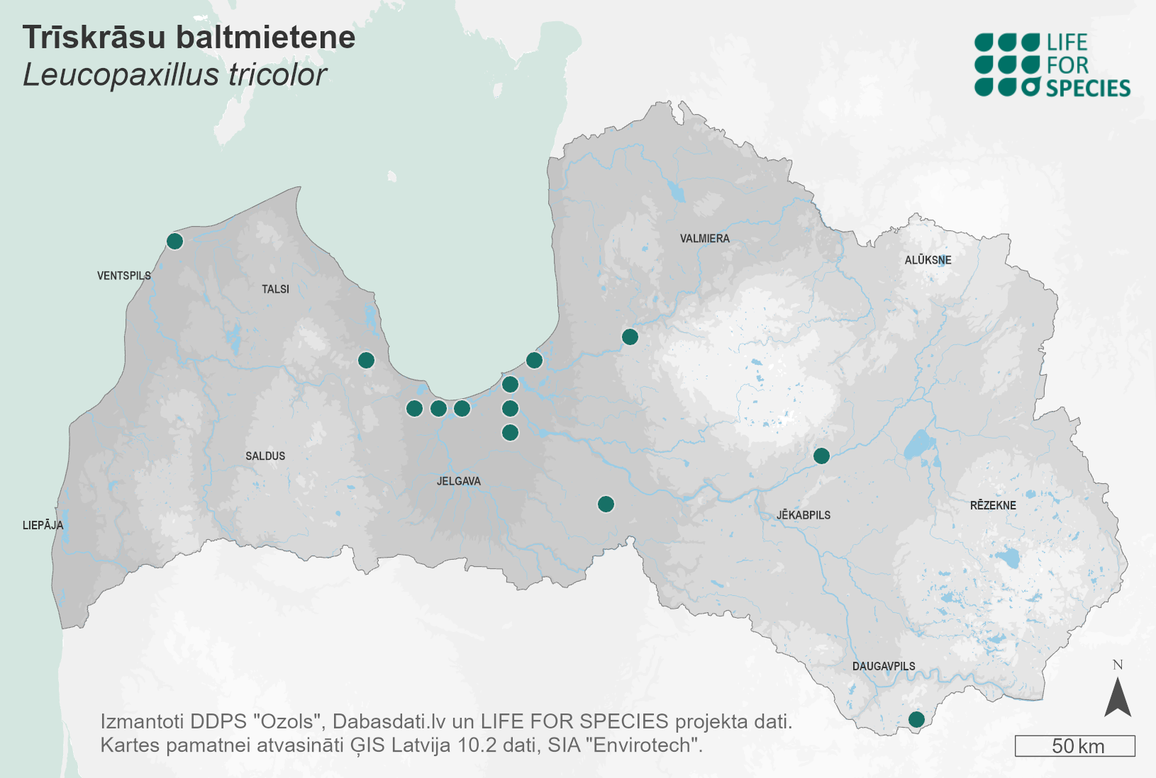 Summary. Funel – Leucopaxillus tricolor. Distributed in Europe, and North America. It is very rare in the temperate and hemiboreal zones in Europe and rare in Latvia with 14 known localities in different regions up to 2022. The EOO is 16,084 km2, and the AOO – 56 km2. No information is available on the distribution changes due to a lack of studies. Data on population size and changes are insufficient. The number of mature individuals probably does not exceed 1,000. It is a forest litter and soil saprotroph. It occurs in various types of deciduous, mixed, mainly old broadleaved (oak) forests on calcareous soils, under oak and beech. In Latvia, it is found in oak forests, and also in various mixed forests with individual oaks. The main threats are related to forest management, which reduces the proportion of old forests. It is assessed as Vulnerable (VU) due to a very small regional population. It is a protected species in Latvia; the legal status must be maintained. About half of the localities are in protected nature areas, e.g. the Gauja and Ķemeri National Parks, the “Silene” and “Piejūra” Nature Parks, the Krustkalni Strict Nature Reserve. To protect the species, it is necessary to preserve undisturbed broadleaved (oak) forests. Research is needed on regional population size, distribution and trends, life cycle and ecology.