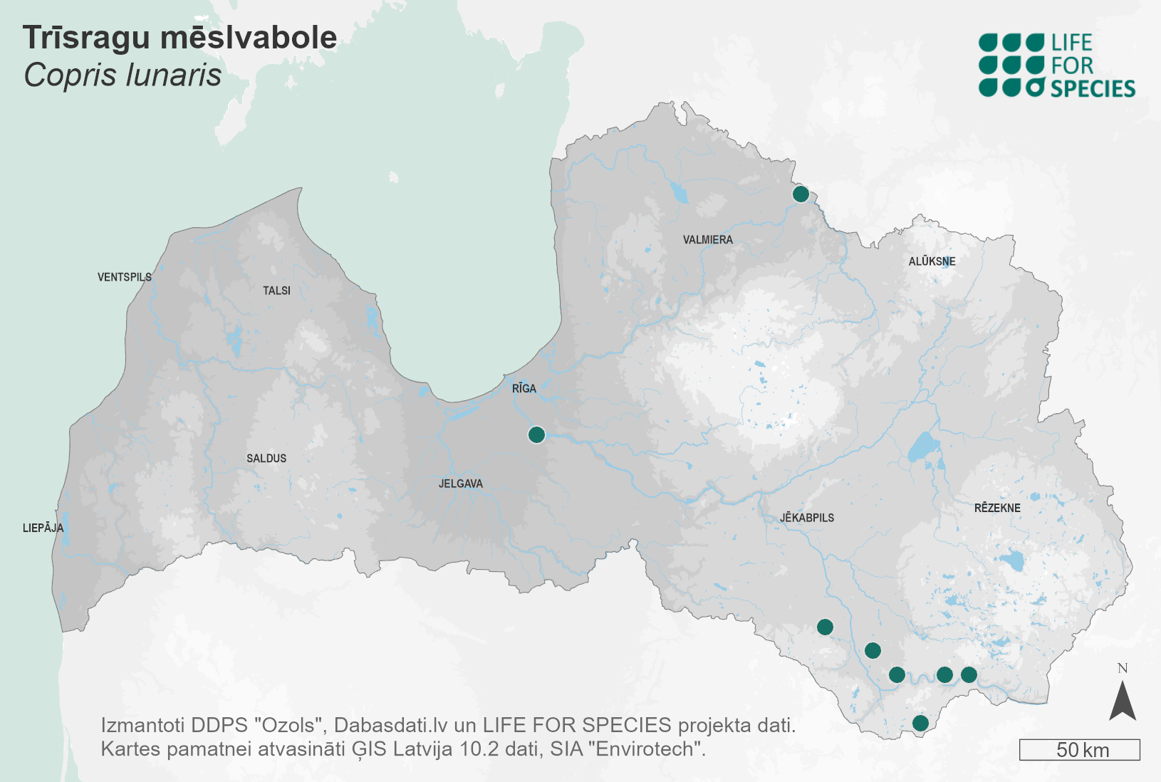 Summary. Horned dung beetle – Copris lunaris. A Palaearctic species, distributed from the Iberian Peninsula to Central Asia and north-western China and from northern to southern Europe (Löbl et al. 2006; eElurikkus 2021). Latvia is located at the northern extent of the distribution range and is partially isolated from other regional populations. In Latvia, C. lunaris is found mainly in the south-eastern part of the country, but it reaches the coast of the Gulf of Riga along the River Daugava valley (Barševskis et al. 2012; Telnov et al. 2005, 2011, 2016) and with one known subpopulation in northern Latvia. The EOO is 17,362 km2, and the AOO is 40 km2. The potential EOO is higher and the potential AOO – at least five times larger. Studies on the size, status and trends of the regional population have not been carried out, but according to the expert’s opinion, the number of mature individuals does not exceed 5,000. C. lunaris is a thermophilic and xerophilic species, which in Latvia is mainly bound to dry meadows and pastures on sandy, slightly clayish or calcareous soils preferring southern exposition. Adults and larvae are coprophagous, found and developing mainly in horse and cattle dung. Threats have not been specifically studied in Latvia, but according to an expert’s opinion, the intensive use of fertilisers in agriculture is leading to the overgrowth of habitats suitable for the species, while coprophagous organisms are directly negatively affected by the active use of dewormers in animal husbandry, including individual farms. The severity of the impact of these threats is unknown. At least one locality in the south-eastern Latvia disappeared between 2000–2024 due to the cessation of grazing in the species’ habitat. It is assessed as Endangered (EN) due to the small AOO that does not exceed 500 km2, the small number of locations (5) and the continuous decline in the extent and quality of habitat as well as localities or subpopulations. It is included in the 2nd edition of the Red Data Book of Latvia (Barševskis 1998). The species is not on the EU or national list of protected species and there is no need to revise its current protection status in Latvia. More than half of the known localities are in protected areas – the “Augšdaugava” Protected Landscape Area, and the “Silene”, “Doles sala and “Dvietes paliene” Nature Parks. The species can be negatively affected by the use of chemicals in plant protection and by the overuse of antibiotics and dewormers in livestock farming and animal husbandry, so they should be limited or avoided in and near the known sites of the species.
