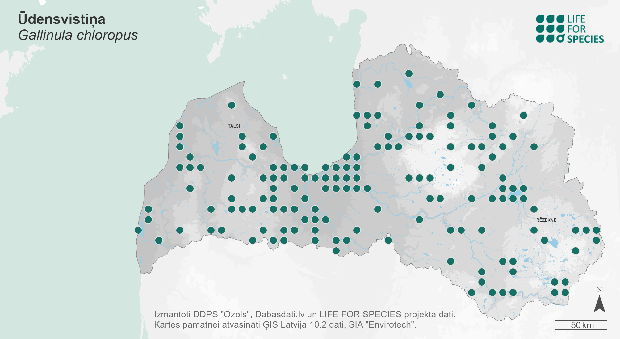 Summary. Common Moorhen − Gallinula chloropus. In Latvia, the distribution declined considerably between 1980–1984 and 2000–2004, while no considerable change was observed between 2000–2004 and 2013–2017. The AOO is 944 km2, the EOO – 66,934 km2. The breeding population is estimated at 523–1,000 pairs (1,046–2,000 adult individuals). The population is declining in the long term, while the short-term trend of the population is unknown. Long-term population decline estimates are based on data of poor quality, therefore, it is impossible to estimate the exact magnitude of change. The species inhabits ponds and overgrown lakes, often in areas where the growth of small shrubs is noted. The threats have not been studied in Latvia, but according to the European assessment the species is threatened by Neogale vison; furthermore, it is susceptible to avian influenza and avian botulism, and, therefore, it may be threatened by future outbreaks of these diseases. The legal status of the species does not need to be changed in Latvia. Conservation of small overgrown wetlands is essential for the protection of the species.