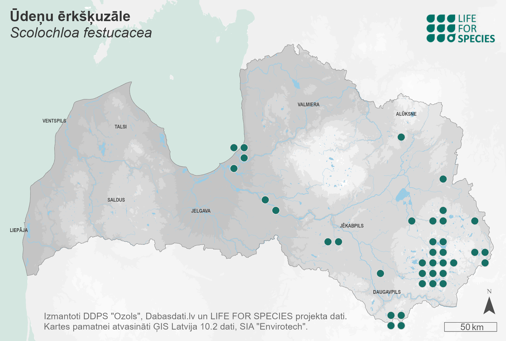 Summary. River-grass – Scolochloa festucacea. In Latvia, the species occurs in scattered and isolated localities. It has been recorded in at least 110 places, including 76 lakes and ten rivers, and in the Ķegums Hydroelectric Power Station reservoir on the River Daugava. The species is more frequently found in eastern Latvia, in the Latgale Upland. Over the past 100 years, the distribution and population size may have decreased slightly. The EOO is 23,997 km2, and the AOO – 432 km2. The species can be found elsewhere in Latvia, but the AOO would still not exceed the threshold of the VU category. It grows in mesotrophic, semi-dystrophic, weakly, moderately, less often strongly eutrophic, mostly clean, shallow, deep and very deep clear-water lakes, as well as in the Daugava Ķegums Hydroelectric Power Station on muddy mineral soil at a depth of 30–150 cm, also in clean slow-flowing rivers. S. festucacea is threatened by pollution of lakes and rivers, overgrowth, drainage of the lake catchment basin, recreation, straightening, deepening and damming of natural rivers. Only a small percentage of the localities, 31 lakes and two river sections, occur in protected areas, e.g., the “Piejūra”, “Numernes valnis” and “Adamovas ezers” Nature Parks, and the “Grebļukalns” and “Istras ezers” Nature Reserves. Lakes with the richest subpopulations should be included in protected areas, and the water levels should be restored in Lake Ārdavs and Lake Sivers. Research is needed on the distribution and population size. The seepage of inadequately treated wastewater into the lakes should be prevented, and measures should be taken to reduce nutrient pollution from agricultural lands. It is recommended to include the species on the list of protected species in Latvia.