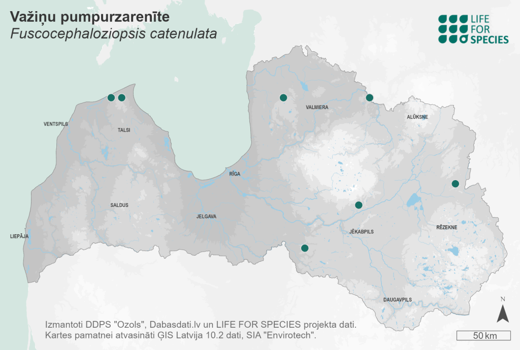 Summary. Chain pincerwort – Fuscocephaloziopsis catenulata. In Europe, the liverwort is found from the Scandinavian Peninsula to central Italy, including western Russia. It was first found in Latvia by B. Bambe in 1999. Only eight localities have been found in almost the entire territory of the country (Aloja, Dundaga, Kārsava, Madona, Nereta, and Valka municipalities), more in northern Kurzeme (the Slītere National Park). EOO is 25,177 km2, and AOO is 32 km2. In Latvia, the regional population size and trends have not been studied. The species is usually found in small numbers on isolated fallen coniferous trees. The species grows in forests on decaying wood, in valleys on steep, shaded cliffs formed by wet sandstone outcrops. In Europe, the main threat is clear-cutting in old, wet forests of various types. There is a lack of information about it in Latvia. Due to unclear AOO and threats, it is listed as Data Deficient (DD). The species is not included on the list of protected species of Latvia. It does not require legal protection status. The species has been found in one protected nature territory – the Slītere National Park. Protection of the localities and habitats of the species should be ensured, and studies on the population size, distribution, trends and threats should be carried out.