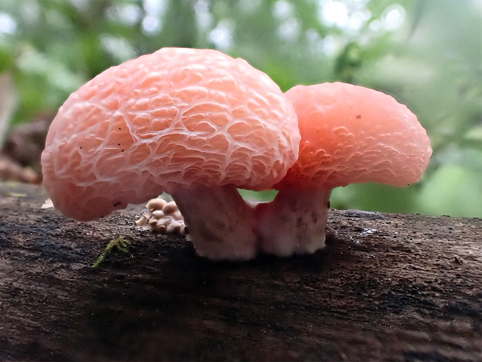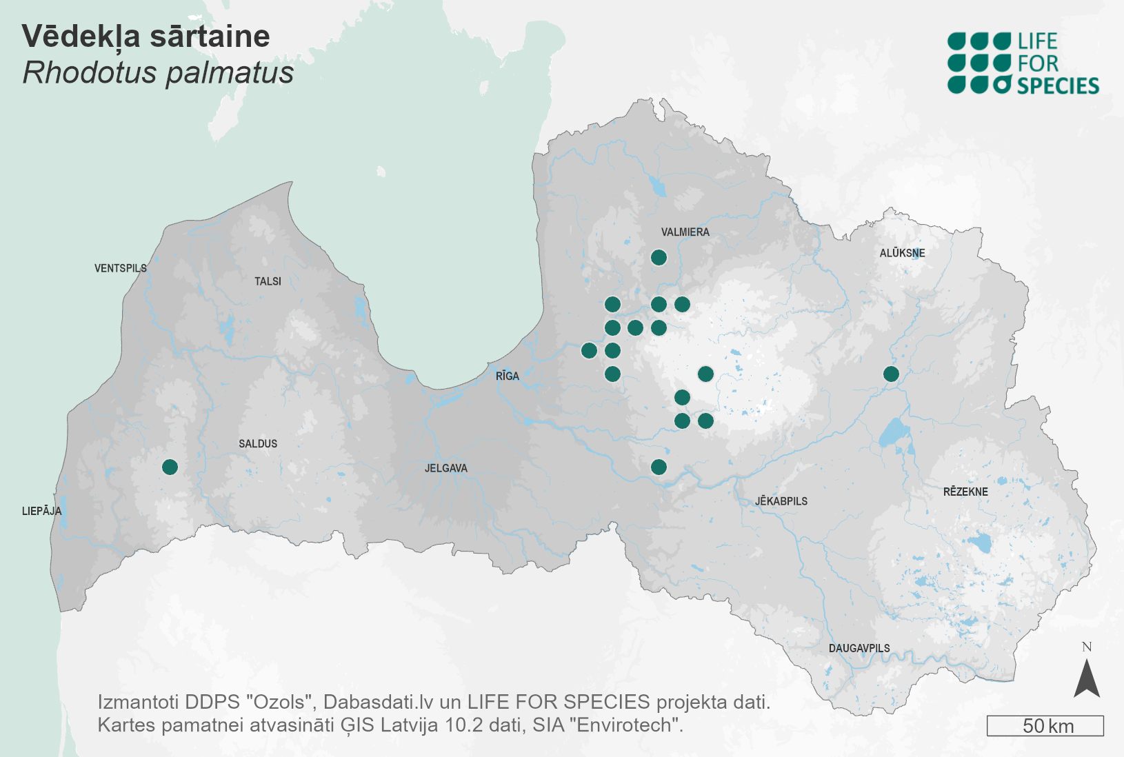 Summary. Wrinkled peach – Rhodotus palmatus. Distributed across Europe, North America, and Asia. In Europe, it is rare in the temperate and hemiboreal zones. It is rare in Latvia; currently 25 localities are known, mainly in the Vidzeme region, and only one locality in the Kurzeme region. The EOO is 13,260 km2, and the AOO – 100 km2. No information is available on changes in the distribution of the species due to a lack of studies; no data on the regional population size and changes. The subpopulation in the Gauja National Park is considered stable. The number of mature individuals probably does not exceed 250. It is a wood saprotroph. In Europe, it occurs on dead wood of deciduous trees, mainly elm. In Latvia, it grows on elm wood, not only in forests, but also in sawmills and on heaps of logs on roadsides. The species is threatened by the removal of dead elm wood from forests. It is assessed as Endangered (EN) due to its small and highly fragmented regional population and AOO, and a predicted decline. It is a protected species in Latvia for which micro-reserves can be established. The legal status of the species needs to be maintained. Most localities are in protected nature areas, e.g. the Gauja National Park, the “Aizkraukles purvs un meži” Nature Reserve, and the “Ogres ieleja” Nature Park. The conservation of the species requires the preservation of dead wood of Ulmus spp. in forests. Studies on the regional population size, distribution and trends, life cycle and ecology are needed.