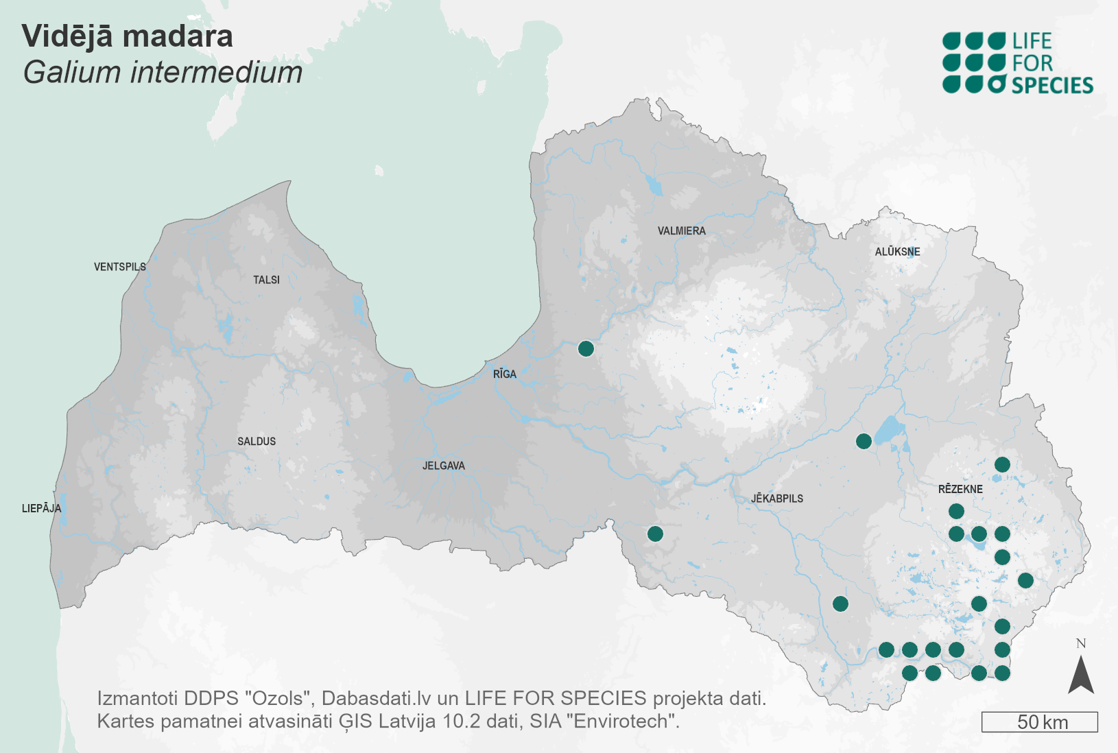 Summary. Bedstraw – Galium intermedium. In Latvia, the AOO is 136 km2, and the EOO – 6,750 km2. There are no reliable data on changes in the AOO and the EOO over the past 20–30 years; however, some earlier recorded localities from the River Daugava Valley near Pļaviņas and Jaunjelgava have been destroyed along with the construction of the Pļaviņas and Ķegums Hydropower stations. That has significantly reduced the EOO compared to the distribution 60–80 years ago. In Latvia, G. intermedium occurs mainly in the south-eastern part of the country. It grows in broadleaf forests, ravine forests and spruce forests with rich herbaceous ground vegetation. Approximately 70% of the known localities are found in protected areas: the “Augšdaugava” Protected Landscape Area, the Rāzna National Park, the “Starinas mežs” Nature Reserve and elsewhere. The main threats are intensive forestry operations, establishment of forest monocultures, drainage, and transformation of small rivers. Considering the occurrence of suitable habitats in Latvia and the fact that several localities have been found in recent years, mainly in south-eastern Latvia, the species may be potentially more common within the EOO. It is necessary to survey the known and potential localities to clarify the population size, distribution dynamics and threats.