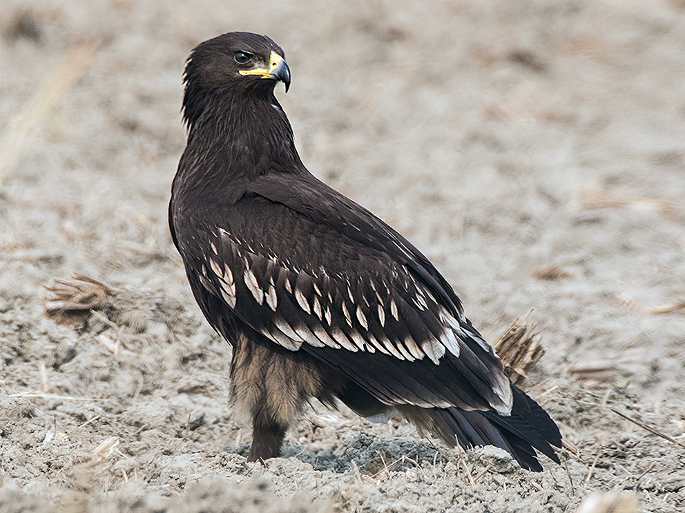 Morfoloģija un bioloģija. Gandrīz vienmērīgi tumši brūns plēsējputns. Barība daudzveidīga – gan grauzēji, gan putni, arī vardes un zivis. Ligzdu būvē vecā kokā un izmanto to ilgus gadus. Dējumā 1–2 olas, gadā viens perējums. Mazuļi ligzdguļi. Gājputns, ziemo Āfrikā un Tuvajos Austrumos (LOB 2002).