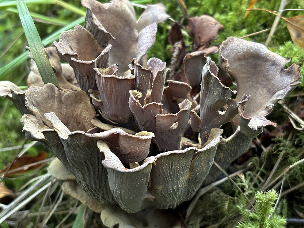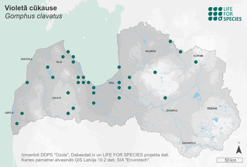 Summary. Pig’s ears – Gomphus clavatus. Distributed across Europe, North America, parts of Asia, and Madagascar. In western, eastern and northern Europe, it is found mainly in lowland areas, while in central Europe it is found in mountainous regions. It is rather rare in Latvia with 34 localities documented in various regions up to 2022. The EOO is 34,235 km2, and the AOO – 136 km2. No information is available on changes in the distribution due to a lack of studies. The regional population is stable, but there are insufficient data on its changes. The number of mature individuals probably does not exceed 1,000. It is mycorrhizal with conifers (pine and spruce) and broadleaves (oak and beech). It occurs in a wide variety of forests, mainly old forests with little impact from economic activities. The species is affected by habitat changes such as logging (removal of old living trees, clear-cutting, etc.), conversion to other types of forest including monocultures, and forest management that reduces the proportion of old forests. It is assessed as Vulnerable (VU) due to a very small regional population. It is a protected species in Latvia. The legal status of the species in Latvia must be maintained. It is found in the protected nature areas, e.g. the Gauja National Park, but most localities are outside these areas. The conservation of the species requires the preservation of suitable habitats – undisturbed forests. Research is needed on the size, distribution and trends of the Latvian regional population, the life cycle and ecology of the species, and trends in suitable habitats for the species.