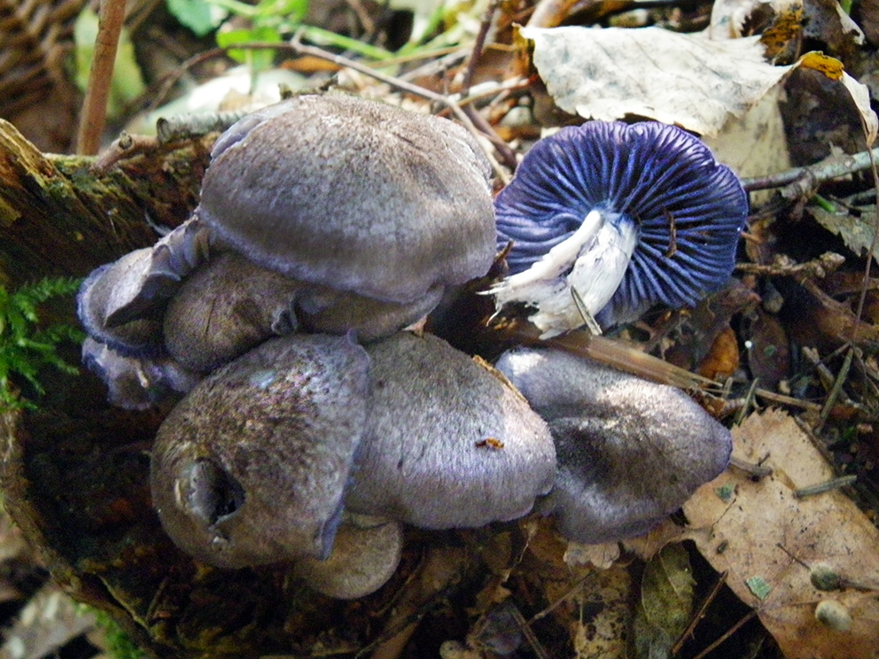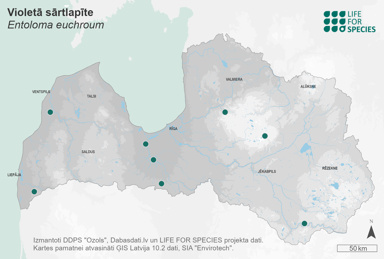 Summary. Stump pinkgill – Entoloma euchroum. Mainly found in Europe, with places in North America, and Asia. It is rare in Europe in the temperate and boreal zones. It is rare in Latvia with eight localities documented in different regions up to 2022. The EOO is 38,777 km2, and the AOO – 32 km2. Data on the regional population size and changes in Latvia are lacking. Although fragmented, the regional population is considered stable. The estimated number of mature individuals does not exceed 1,000. It occurs mainly in moist deciduous forests. It is a wood saprotroph, occurs on living or dead deciduous wood (grey alder, alder, and less frequently hazel, etc.). The species is mainly affected by the removal of dead wood from wet deciduous forests. It is assessed as Vulnerable (VU) due to a very small regional population. It is a protected species in Latvia. The legal status of the species in Latvia needs to be maintained. It is found in protected nature areas – the Gauja National Park, the “Dunika” Nature Reserve, and the “Daugavas loki” Nature Park. It is important to preserve dead wood (logs, stumps and snags), both those already inhabited by the fungus, and those that are potentially suitable habitats for the species. Further research is needed on the occurrence of the species, regional population size and changes, ecology and threats.